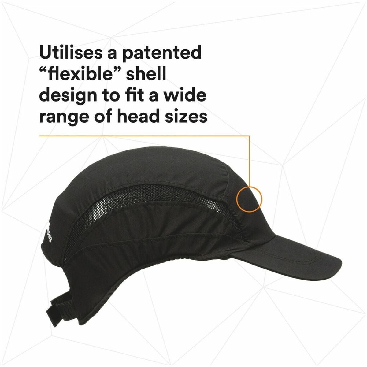 Ventilationsnät på mössans sidor och i hjässanmaximerar andningsaktiviteten. Det elastiska inställningsbandet går djupare ned i nacken än vanligt, vilket gör att mössan sitter säkrare.