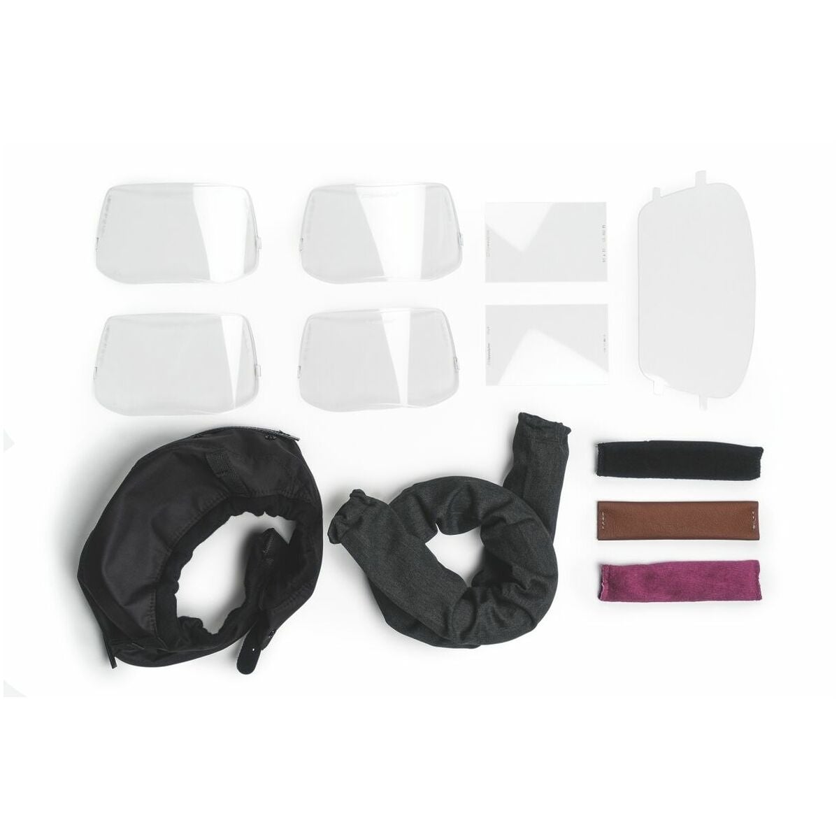 - Förbrukningsmateialsats (3 svettremmar av mjuk bomull, frotté (nr 098004) och läder, 2 invändiga försättsrutor (nr 098002), 4 utvändiga standardförsättsrutor (nr 097930), visir, luftslangöverdrag. ansiktstätning.