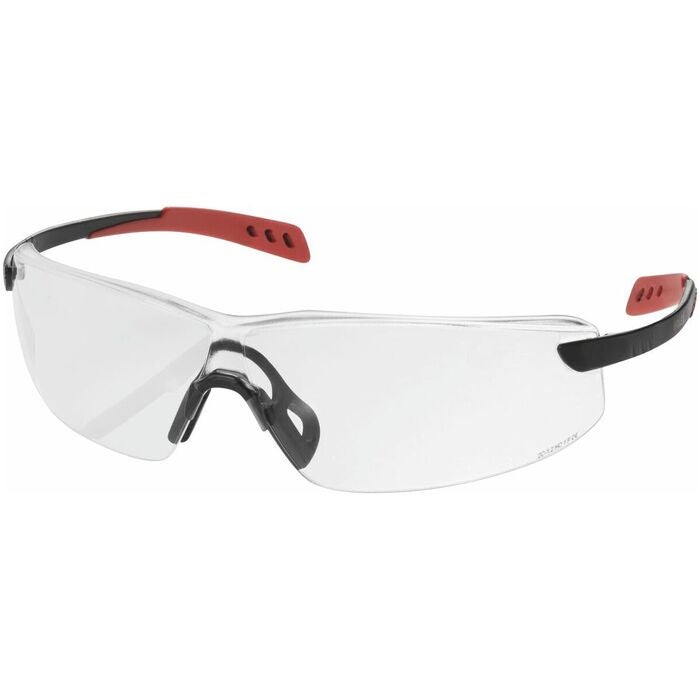 Skyddsglasögon med inskjutbara skalmar med låg vikt och som är sköna att bära gångjärnslösa Flex-skalmar av 2-komponentsmaterial. Med mjuk näsbrygga för hög komfort. Det välvda glaset ger ett extra bra sidoskydd och 180° synfält utan förvrängningar.