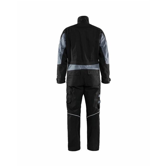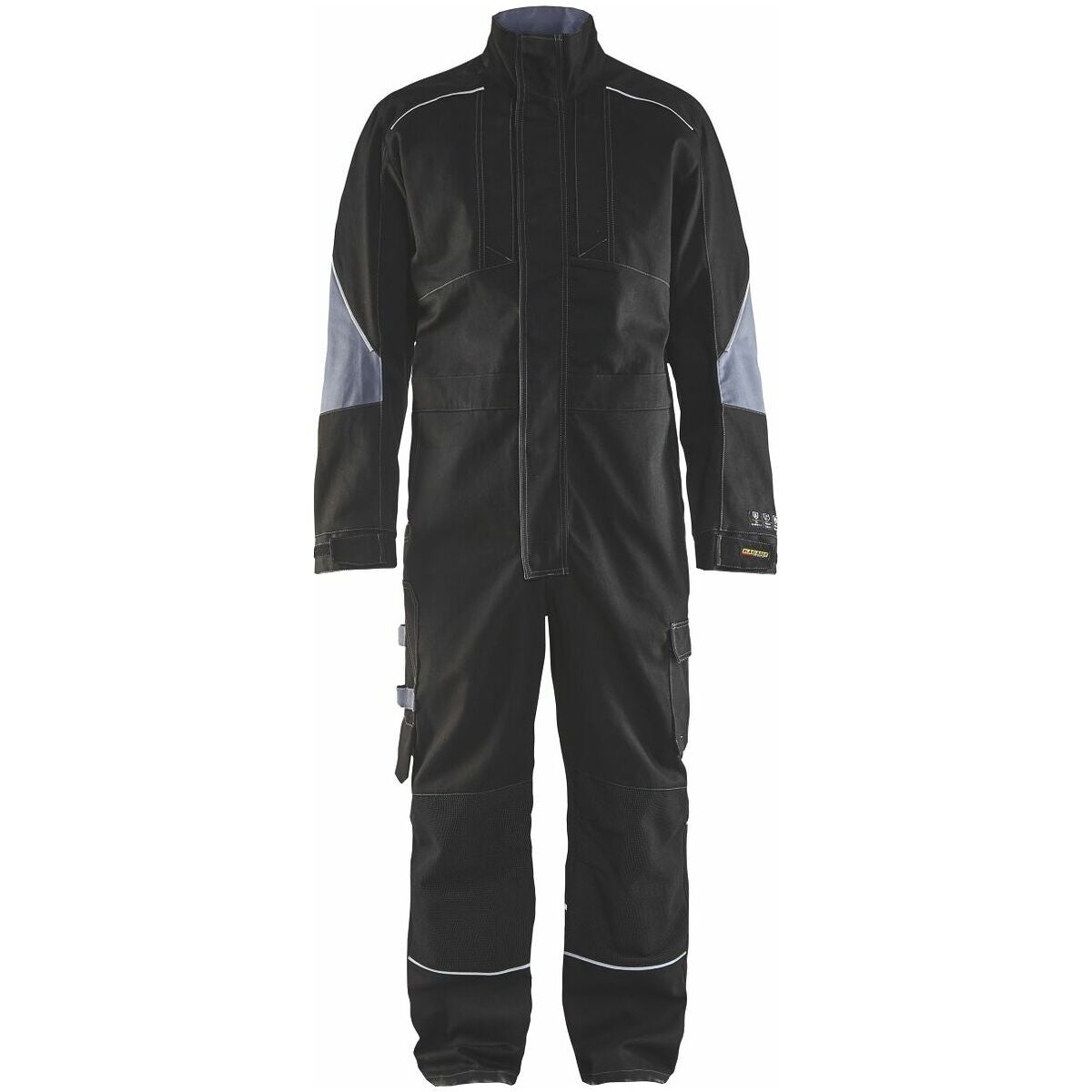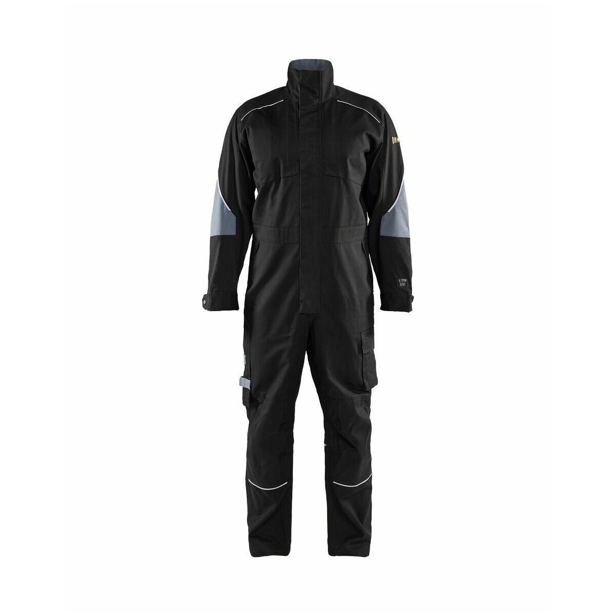 Den robusta flamskyddsoverallen har justerbar elastisk midja och förformade armbågar. Manschetterna kan fixeras med kardborrbandlås.