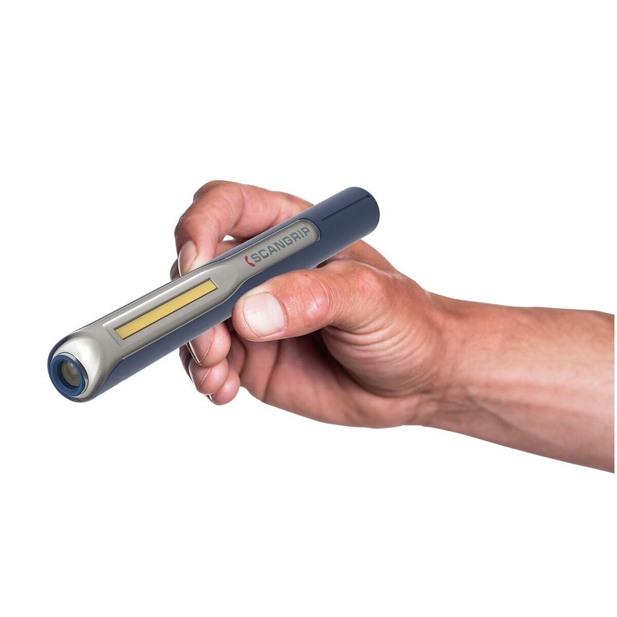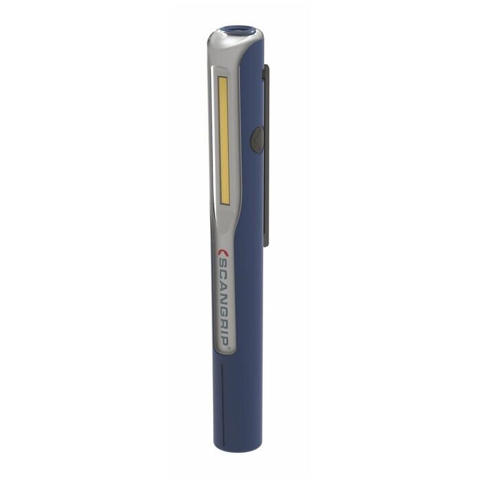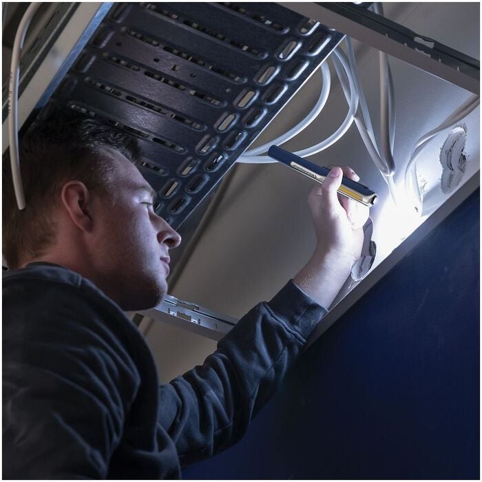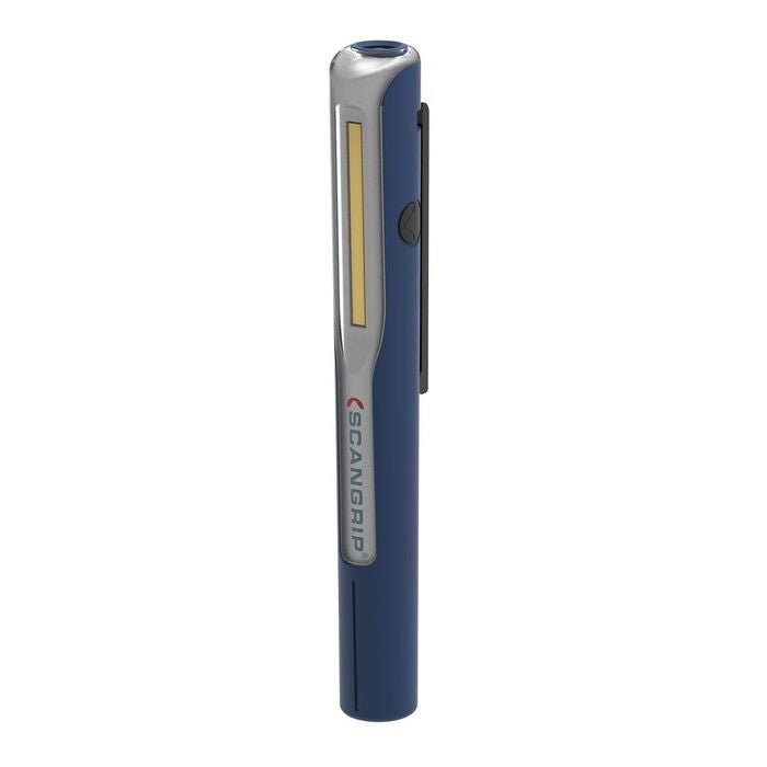 Ljusstark LED batteridriven universallampa med huvudbelysning på sidan och spotlight på lamphuvudet. Med inbyggd magnet och fickklämma.