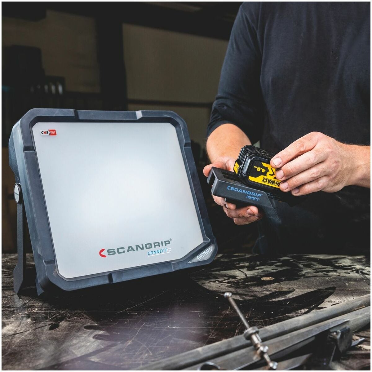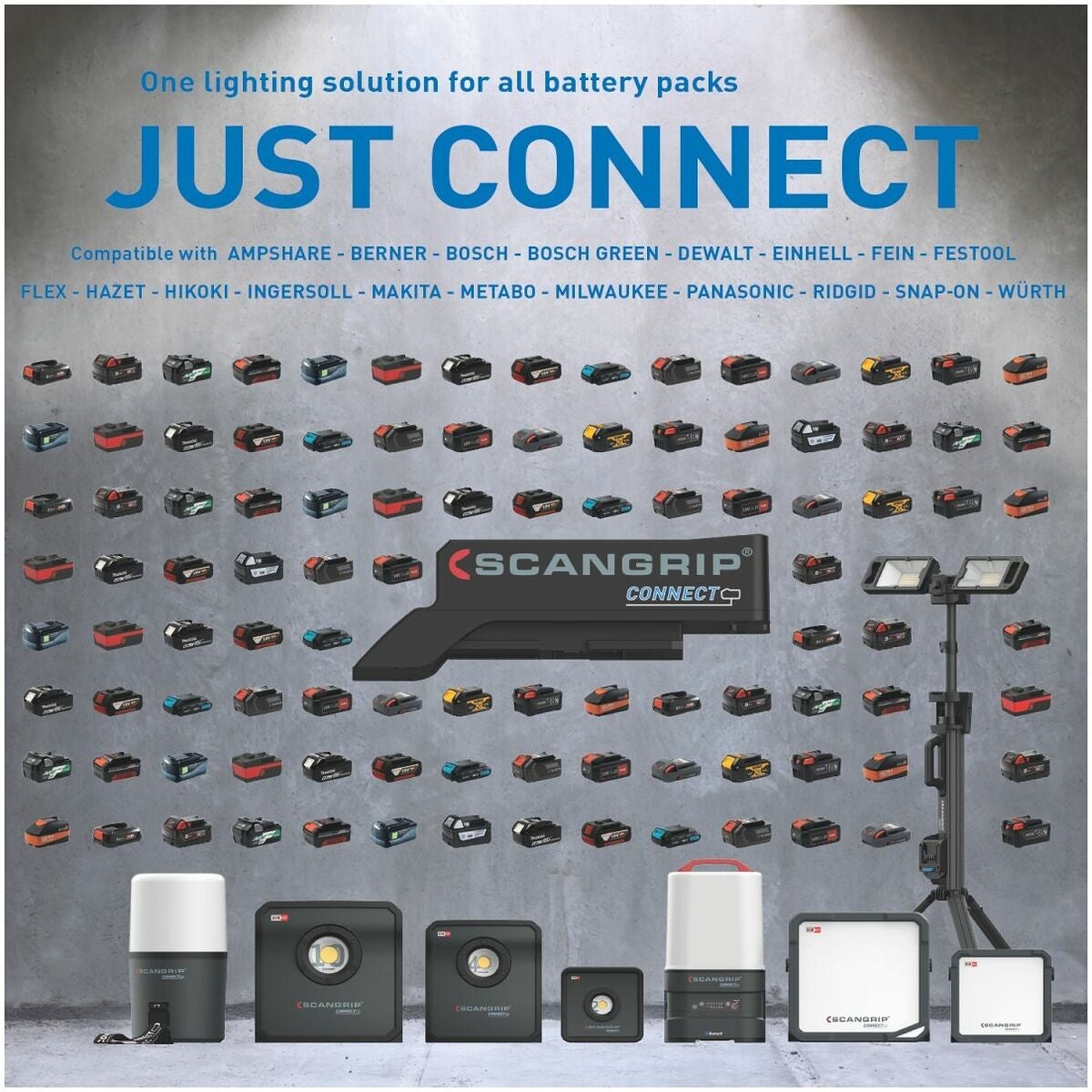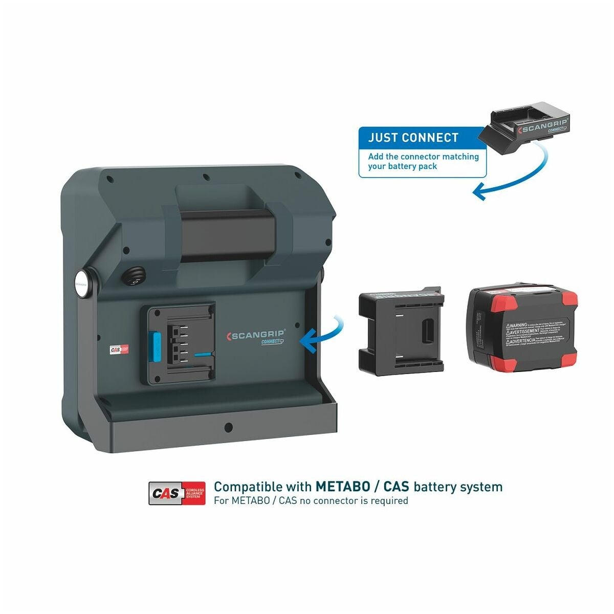 Scangrip CONNECT arbetslampor är baserade på CAS-systemet och är dessutom kompatibla med 18 V batterier från alla ledande elverktygstillverkare.
