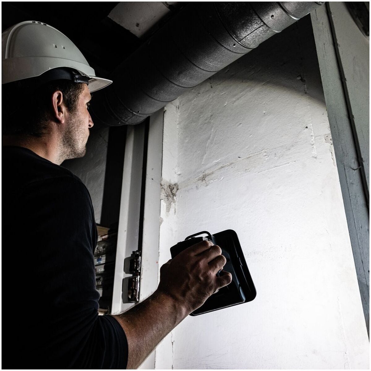 Batteridriven LED-högkapacitetsstrålkastare med dimmfunktion. Höljet av formsprutat aluminiumgjutgods är extremt robust och