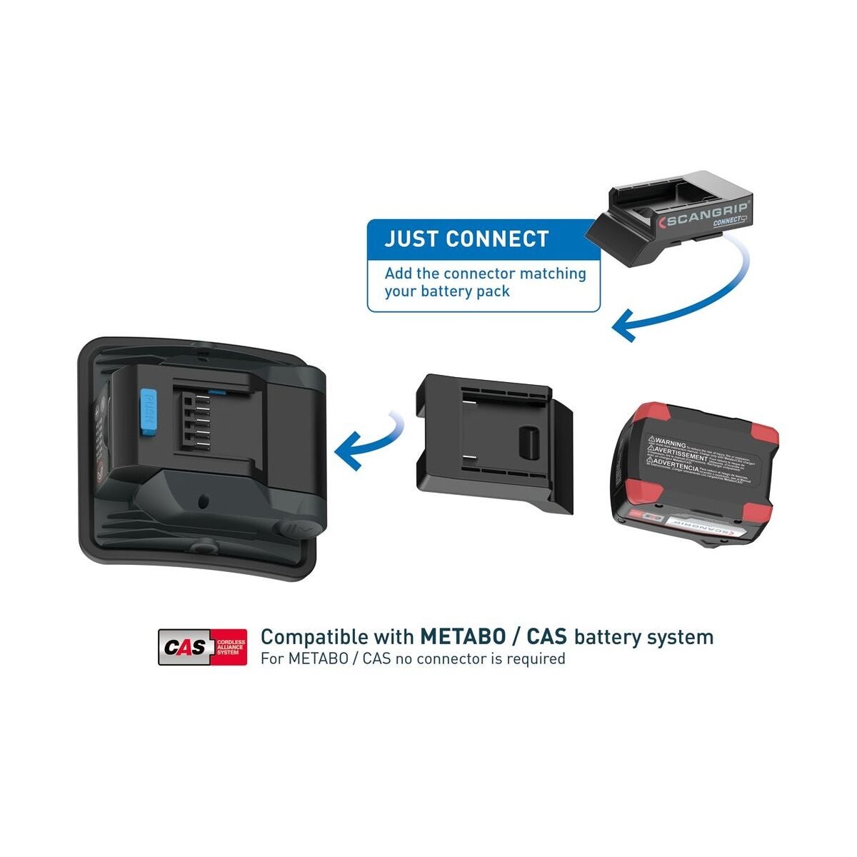 Scangrip CONNECT arbetslampor är baserade på CAS-systemet och är dessutom kompatibla med 18 V batterier från alla ledande elverktygstillverkare.