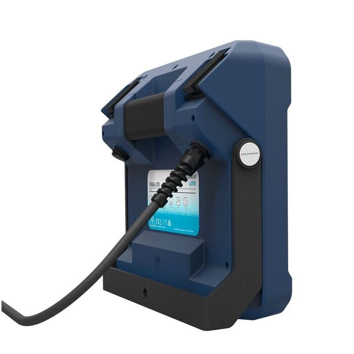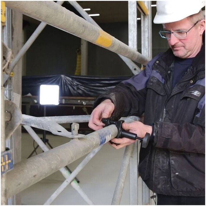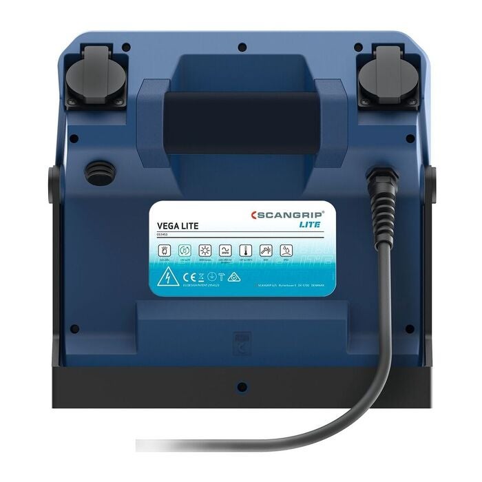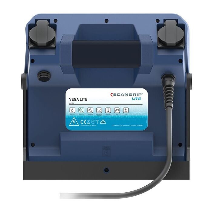 Med integrerat handtag och stativfot för direktmontering av byggstrålkastaren. Två jordade eluttag gör att elverktyg kan anslutas snabbt och enkelt utan att extra kablar behöver användas.