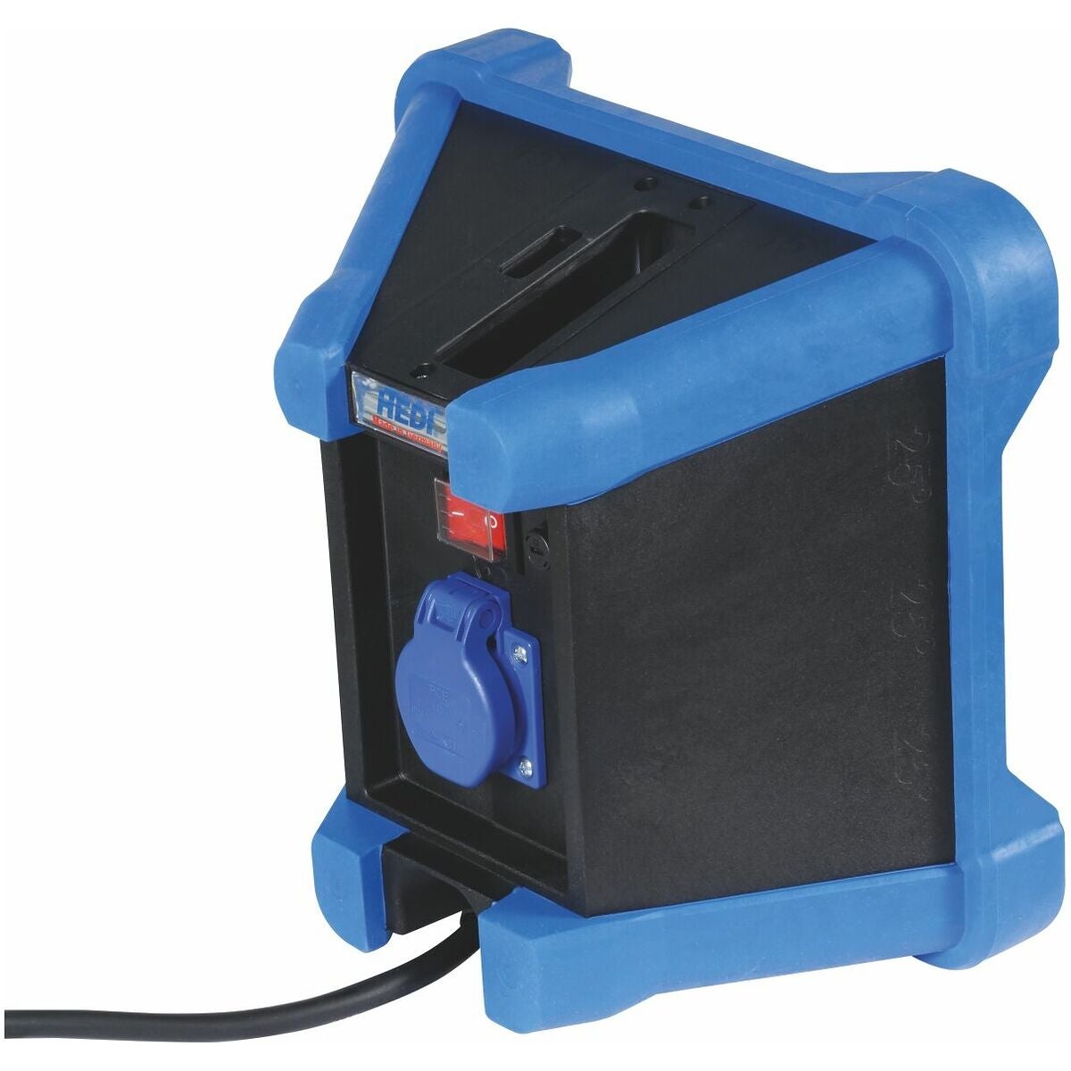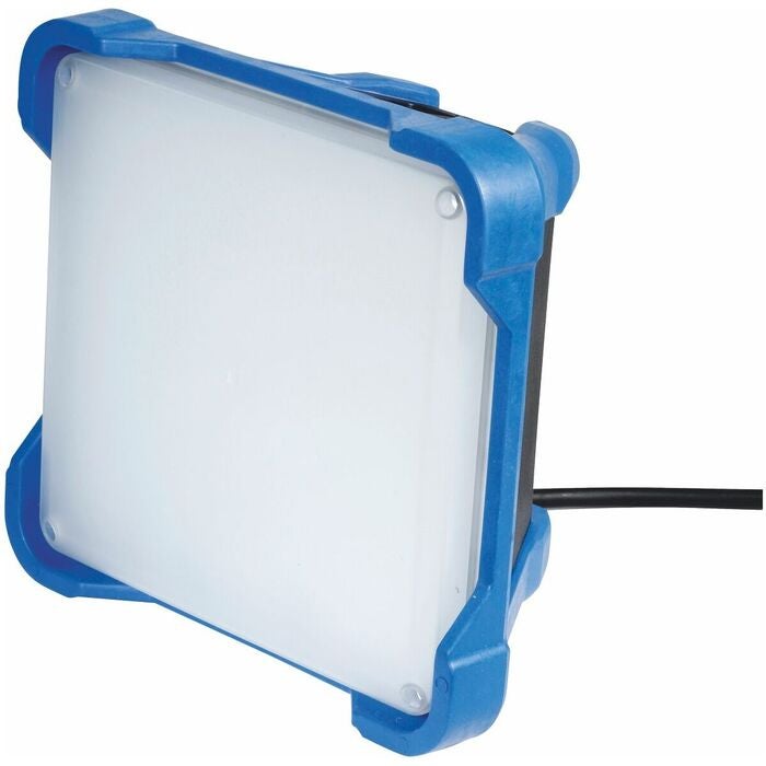 Robust arbetslampa med gummerade detaljer på sidorna och fem lutningsvinklar beroende på position (90°, 35°, 25°, 15°, 0°). Integrerat bärhandtag, PÅ/AV-knapp på baksidan. Godkänd för varaktig användning utomhus samt på bygg- och monteringsplatser enligt BGI 608.