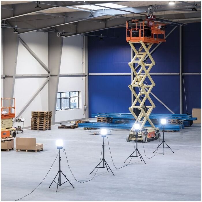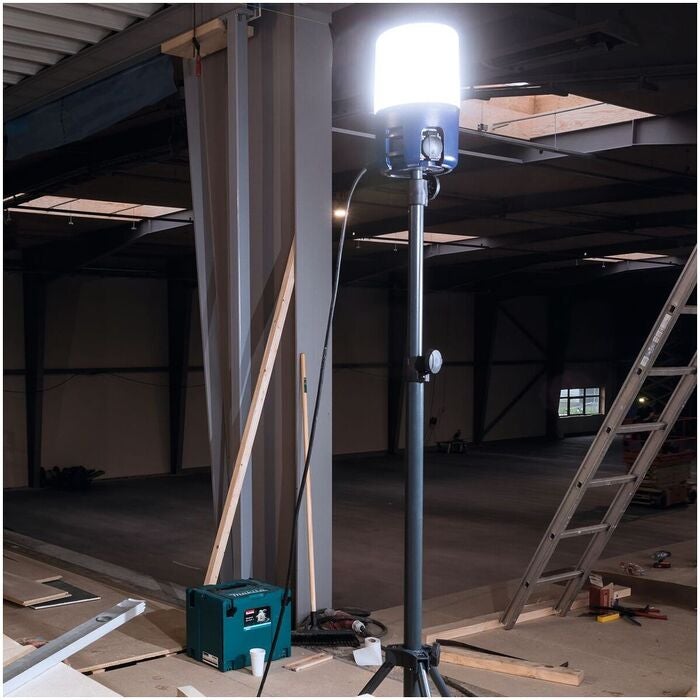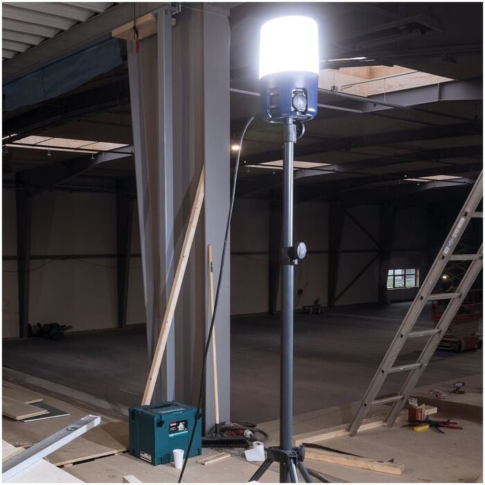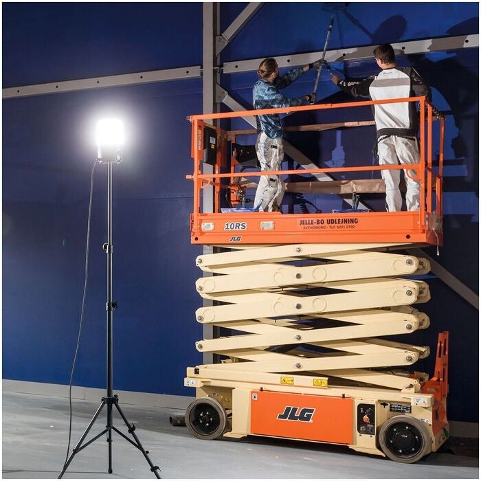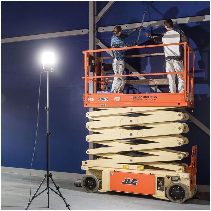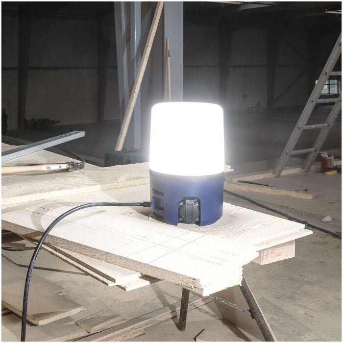 Högeffektiv 360° arbetslampa med jordat eluttag. Lampan kan hängas upp överallt i en kraftig krok eller ställas upp direkt på arbetsbänken.