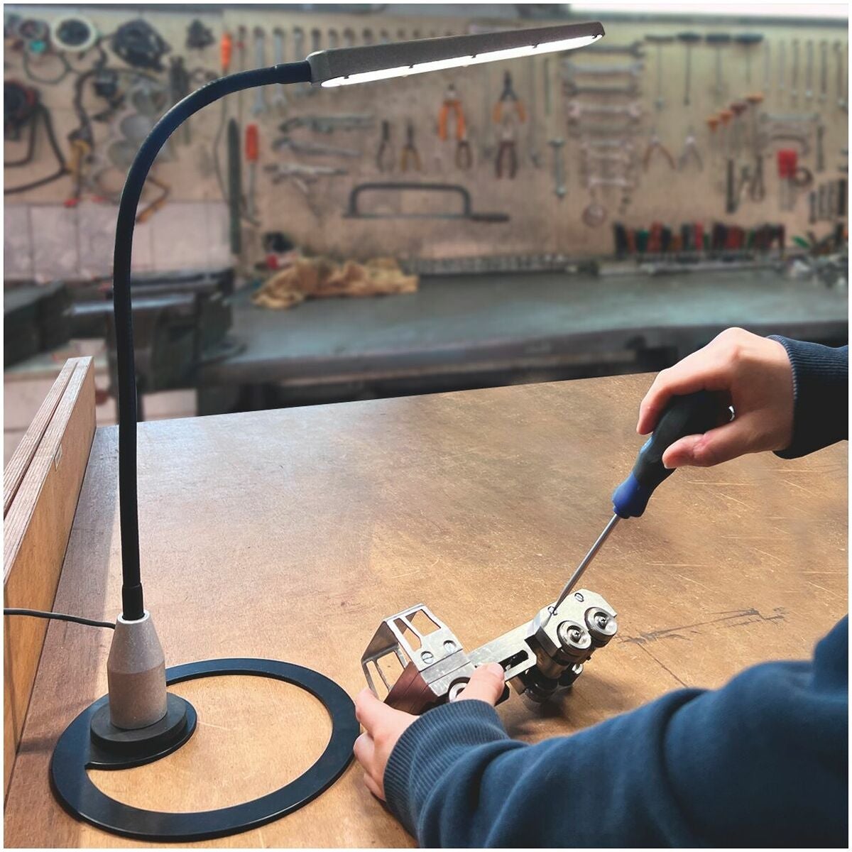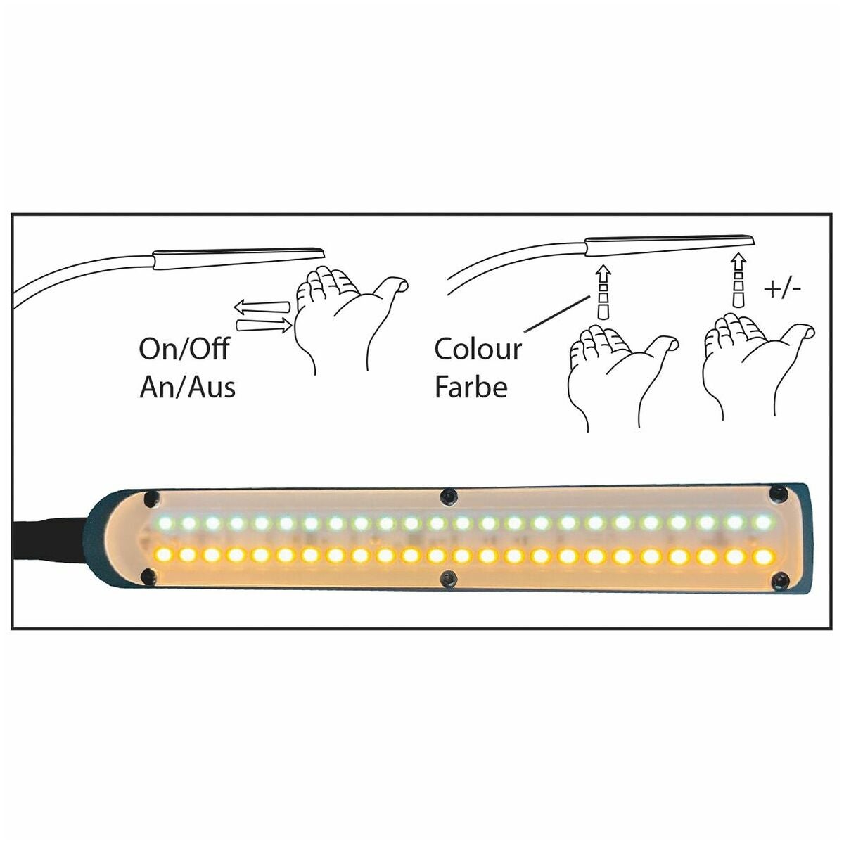 Innovativ arbetsplatslampa med geststyrning i lamphuvudet för tändning och släckning samt dimfunktionen. Färgtemperaturen kan ändras efter behov. Lampan kan användas variabelt i olika tillämpningsområden.