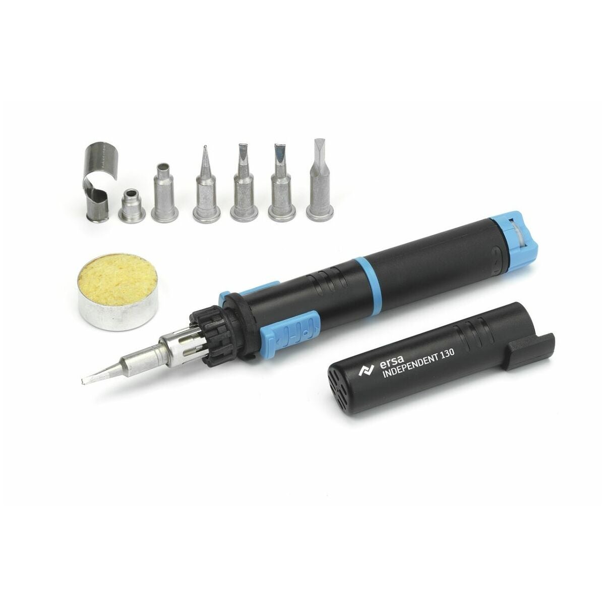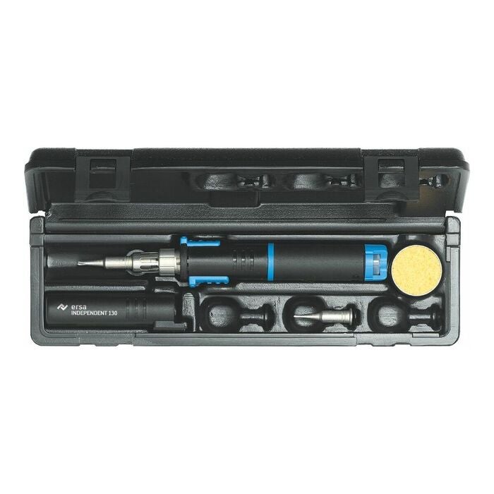 Inklusive mejselformade lödspetsar 1,0; 2,4; 3,2 och 4,8 mm. Munstycken för lödning (max 1400 °C) och uppvärmning (max 700 °C), glödkniv, reflektorplåt för krympning av krympslang, rengöringssvamp och svamphållare i praktisk plastlåda.