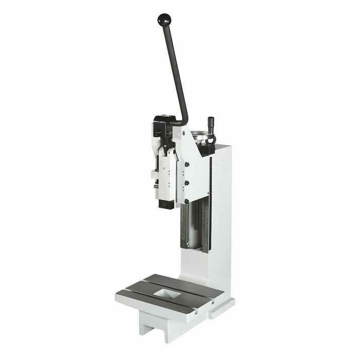 Stabil, ihålig stomme av gjutgods med stor basyta. Stödplatta med fyra fästhål för montering på arbetsbänk eller liknande. Fästsliden för pressverktyg löper spelfritt i en prismatisk styrning och kan ställas in i höjdled. Dessutom går det att ställa in rörelsevägen (slaglängden) på önskat värde med en ställskruv. Uppspänningsplanet är försett med 10 mm T-spår för montering av inspänningsanordningar.