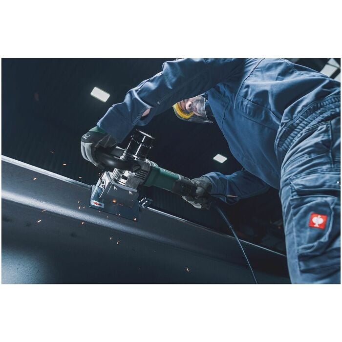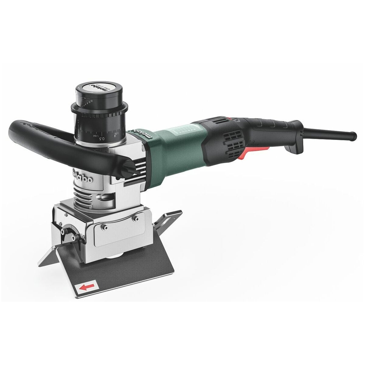 One-touch styrenhet. Patenterad, verktygslös justering av fräsdjupet i steg om 0,1 mm. Spärrpunkter för korta inställningstider, för att förhindra oönskad justering av fräsdjupet vid arbete. Exakt justering av fasvinkeln direkt via styrplattorna. Universellt fräshuvud med tre hårdmetallskär för alla fasvinklar från 0 till 90 grader. Kontrollerat arbete tack vare stora styrplattor. Stopprulle för styrning av rör för enkel förberedelse av svetsfogar. Verktygsfritt justerbart handtag för säker och jämn styrning. Metabo Marathon motor med patenterat dammskydd som ger lång livslängd. Vario-Constamatic (VC)-helvågselektronik med inställningshjul för arbete med materialanpassade varvtal som förblir konstant under last. Elektroniskt överbelastningsskydd, mjukstart och återstartskydd. Användarskydd tack vare vid sidoplåtar för spånavledning. Med metaBOX, den intelligenta lösningen för transport och lagring, se bild.