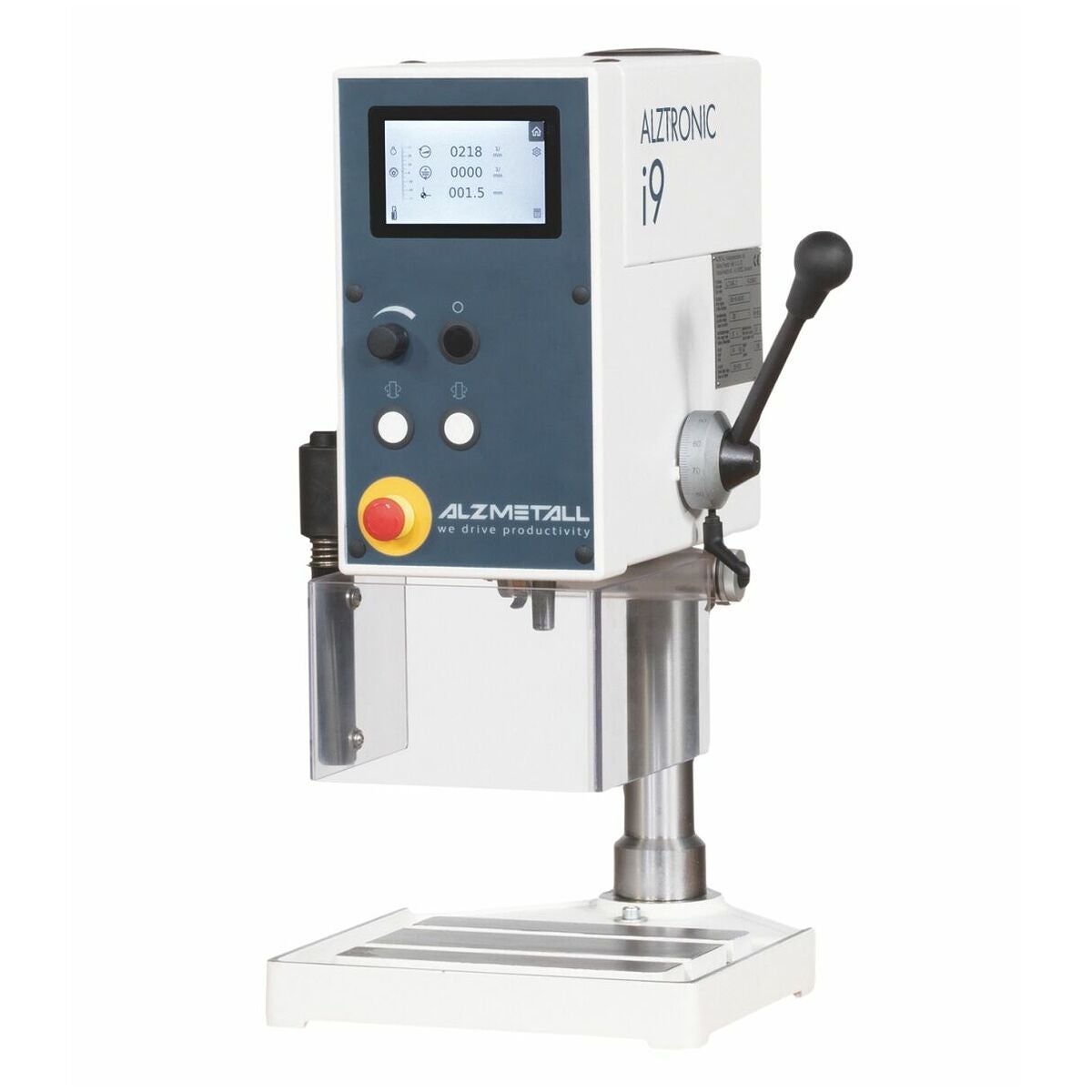 - 5 tum TFT - LCD-display med pekfunktion: Manuell inmatning av spindelvarvtalets börvärde, visning av aktuellt varvtal, integrerad borrdjupindikering med peklagring nollpunkt, virtuell borrdjupskala på displayen, maskintillståndsindikeringar och varningstexter på displayen, serviceinformation, fritt valbart operstörsspråk: DE/ EN/ FR/ ES/ IT/ NL/ RU.