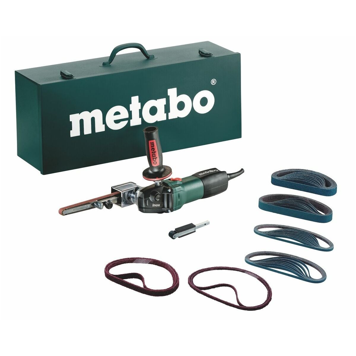 Extra handtag, låda av stålplåt, slipbandarm (6, 13, 19 mm), 10 slipband (6 x 457 mm; P60), 10 slipband (6 x 457 mm; P120), 10 slipband (19 x 457 mm; P60), 10 slipband (19 x 457 mm; P120), 4 filtband.