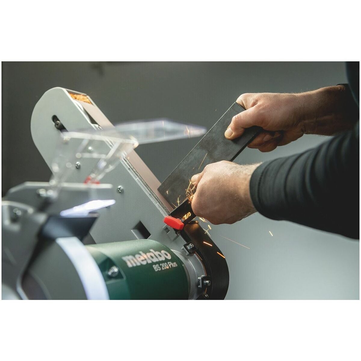 - Flexibelt arbete på den stora slipytan eller alternativt på avrundningen av sliparmen.