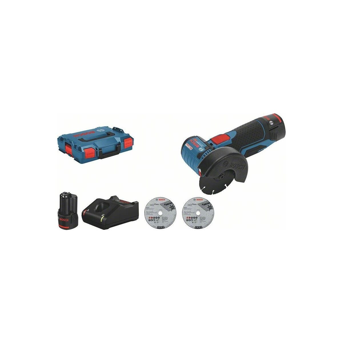 Inklusive L-BOXX, L-BOXX inlägg 1/2 för batteri och laddare, snabbladdare GAL 12V-40 Professional, 2 st konsthartsbundna kapskivor, 1 st hårdmetallkapskiva, Expert for Inox, 76 × 10 × 1 mm, skyddskåpa.