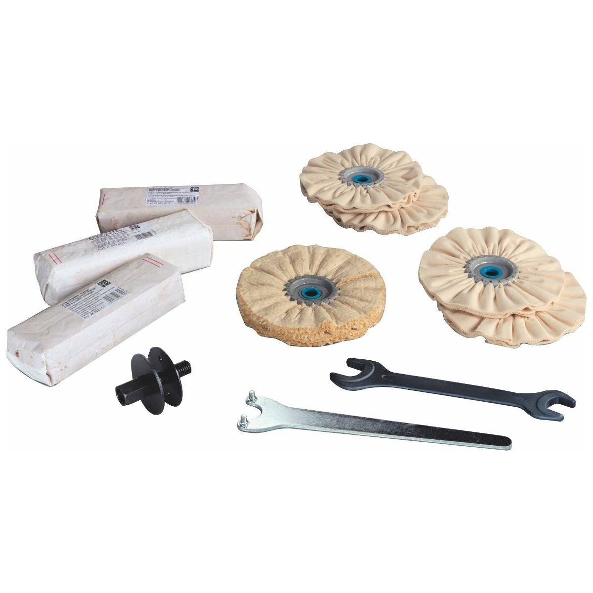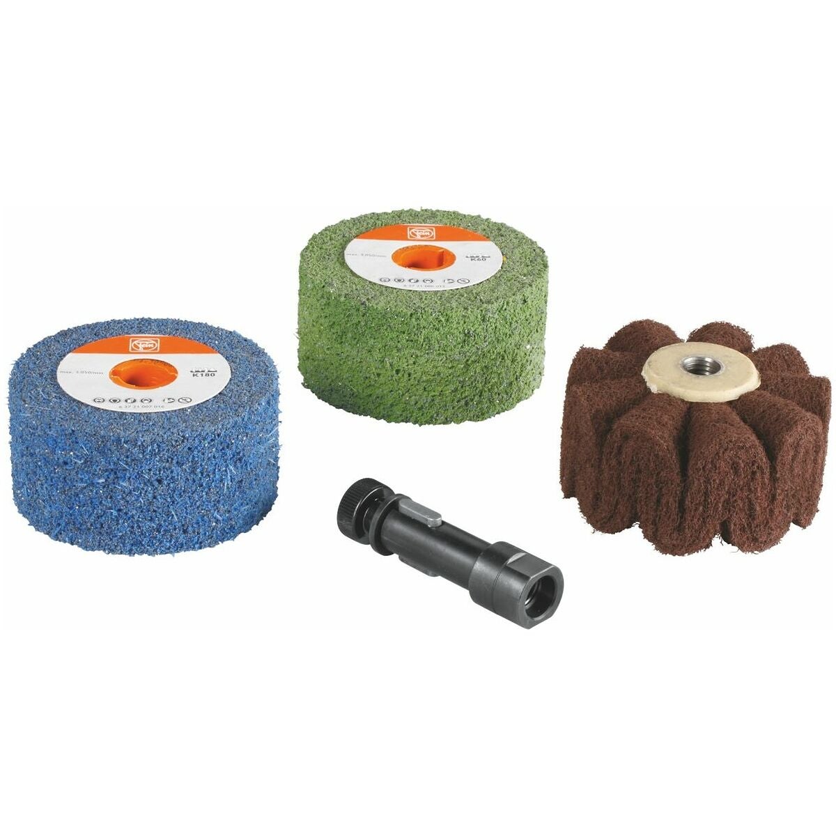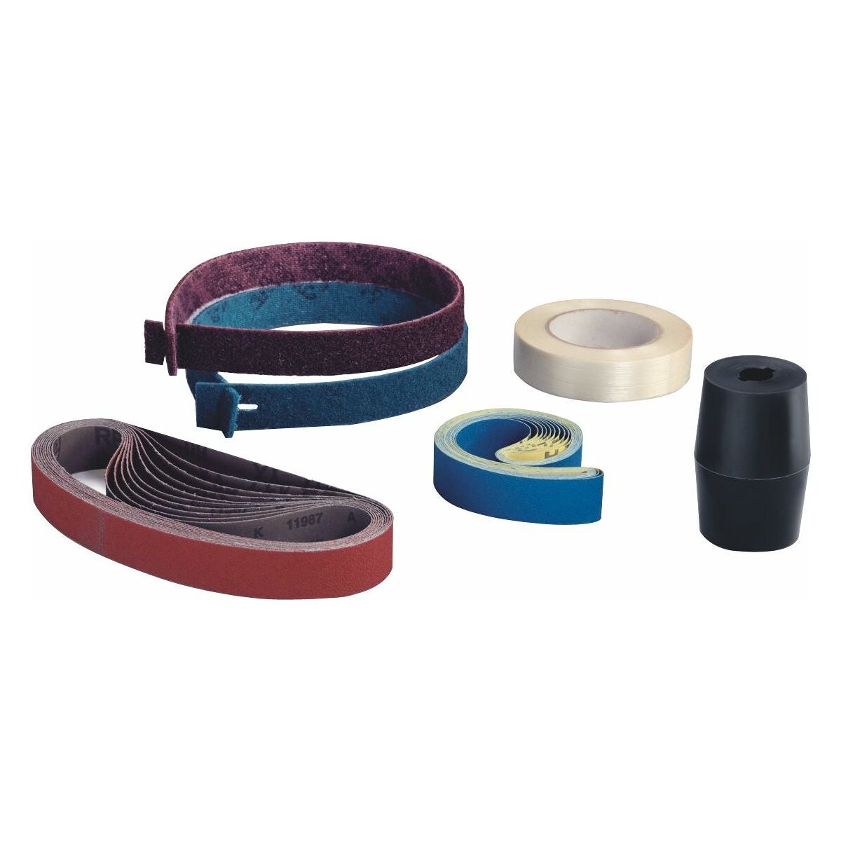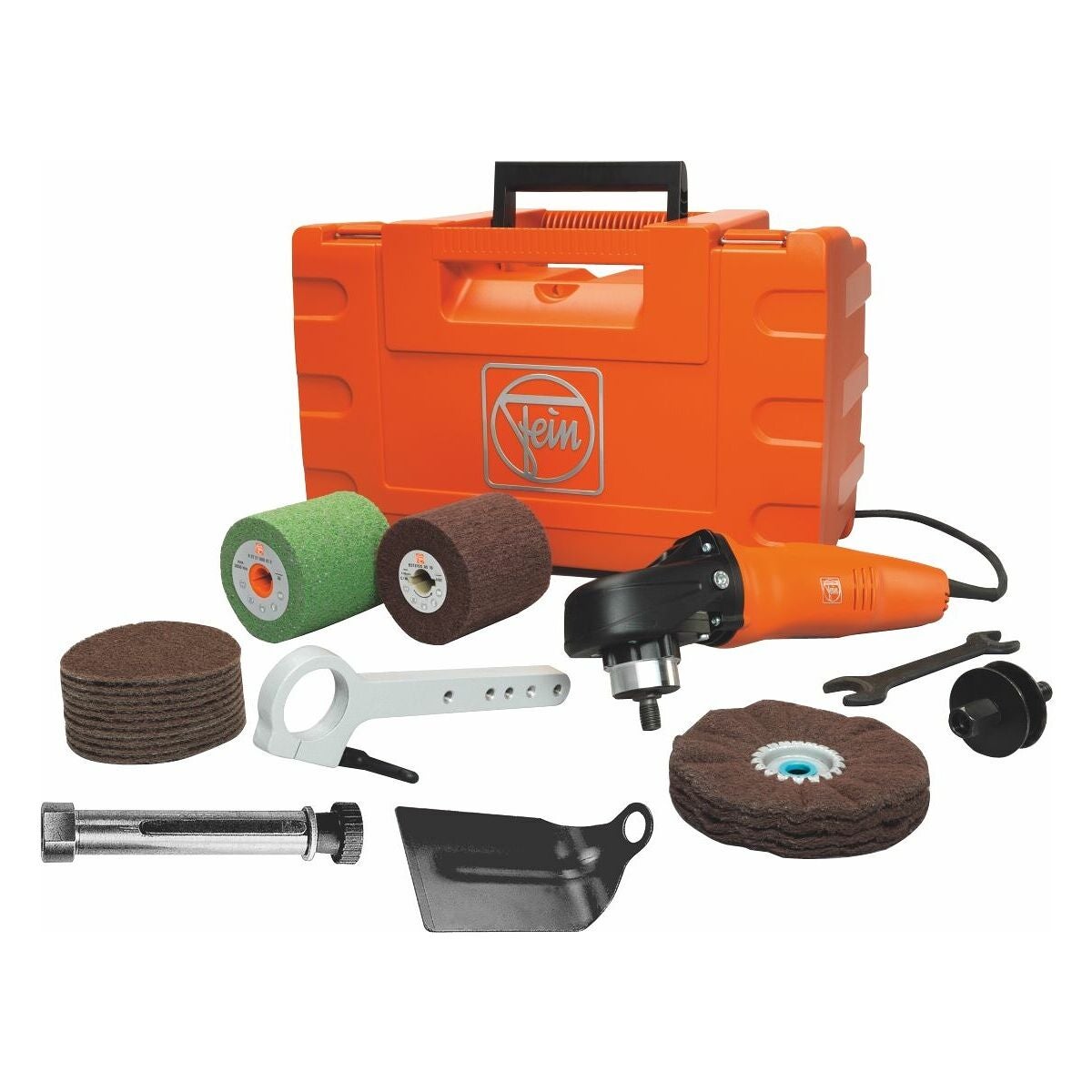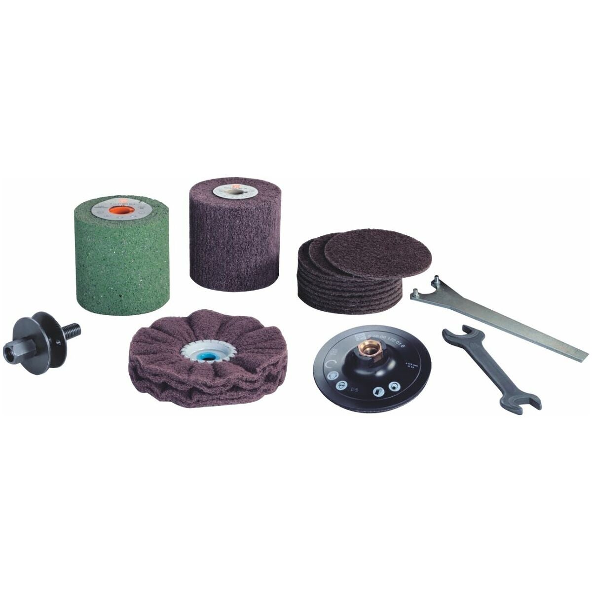 1 transportväska, 1 hållare (vridbar), skyddsbygel, spänntapp för valsar och rullar med universalkilspår (100 mm), elastisk slipvals, (100×100 mm, kornstorlek 60), lamellslipnylonvals (100×100 mm, kornstorlek 180), stödrondell med kardborrfäste (⌀ 115 mm, M14), 1 slipnylon med vågform 30×150 mm, spänntapp 15 − 50 mm, 10 slipnylon med kardborrfäste (⌀ 115 mm fina).