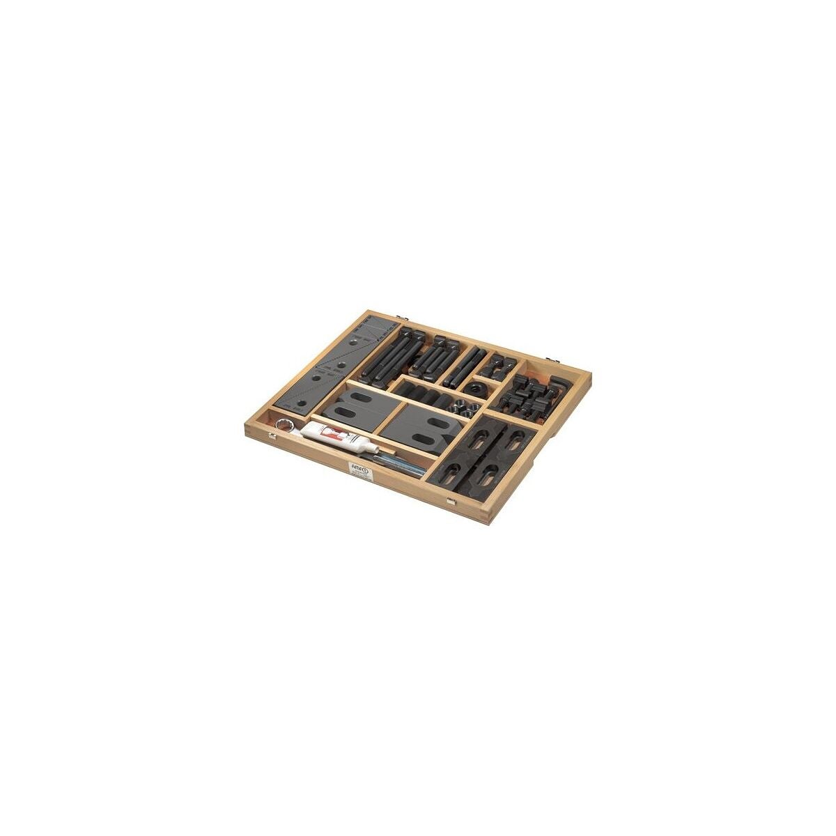 Består av olika spännelement som behövs för snabb uppspänning av verktyg, utrustning eller arbetsstycken på T-spårbord. Alla detaljer är av seghärdat stål och kan anskaffas separat.