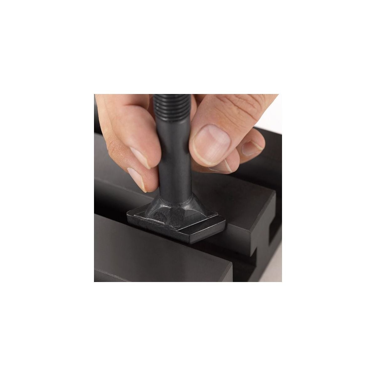 På långa maskinbord underlättas en senare montering av en spännpunkt. Spännskruven sätts in ovanifrån i T-spåret.