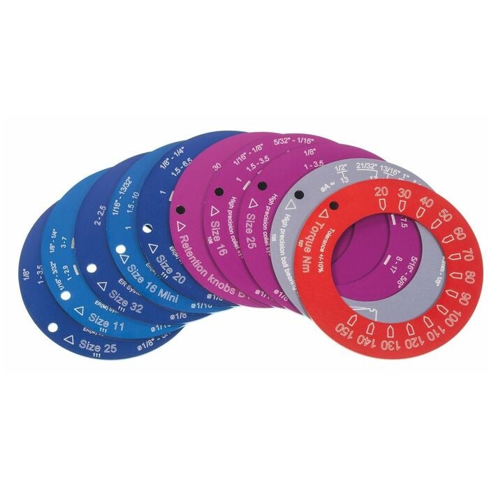 Inkl. 5 ringar för standard-ER-spänntångchuckar, 3 ringar för precisionsspänntångchuckar, 1 ring för kullagrade spännmuttrar, 1 ring för allmän vridmomentangivning.