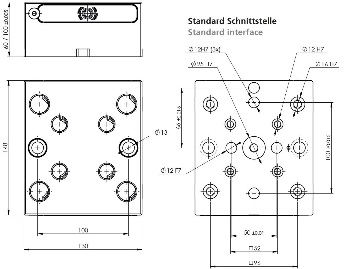 gre4doc 5-axlig kombihöjningsmodul 52x52 mm och 96x96 mm, höjd 100 mm. Utan spännbultar.