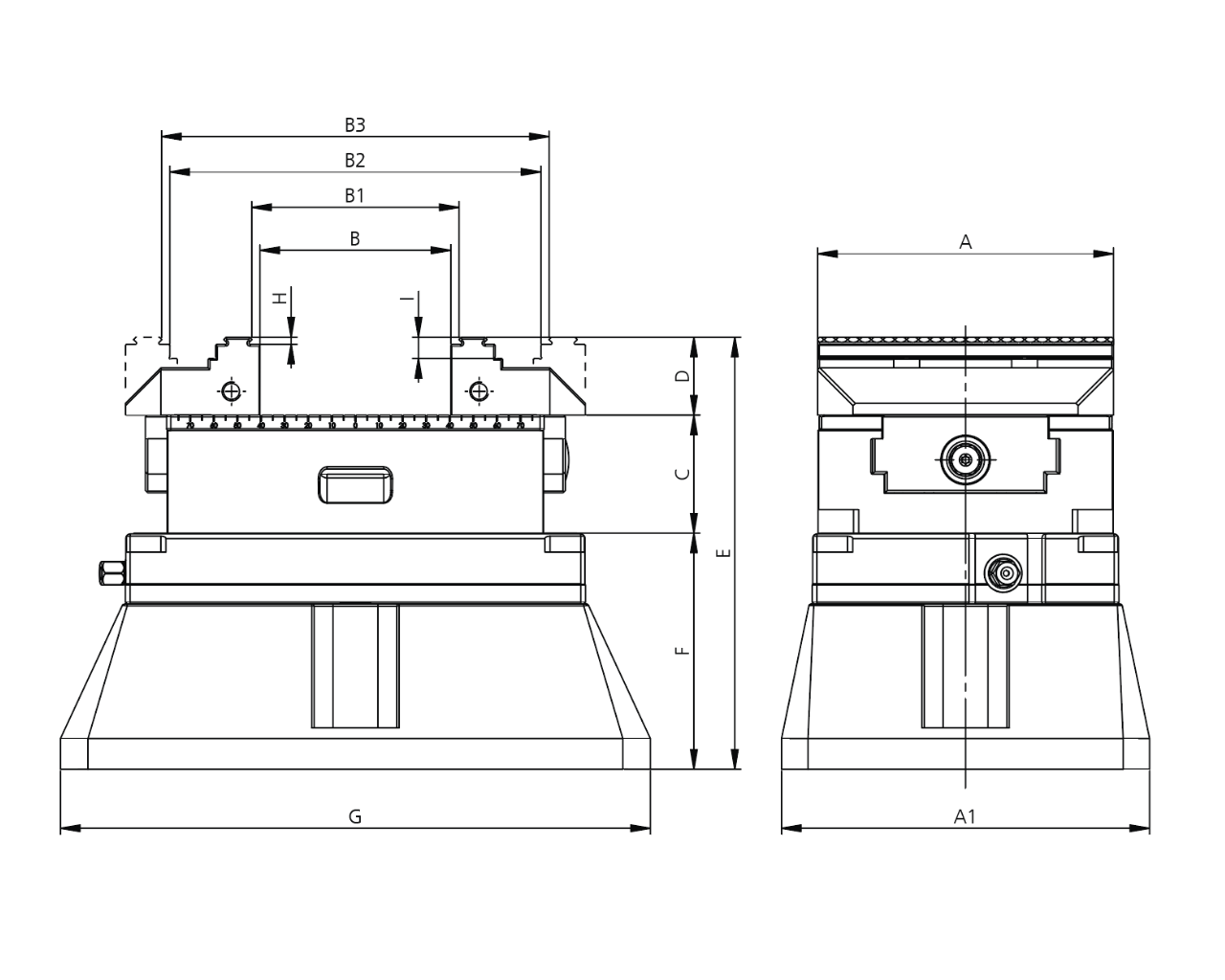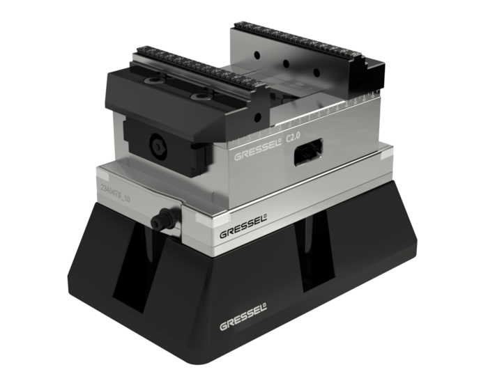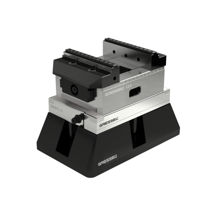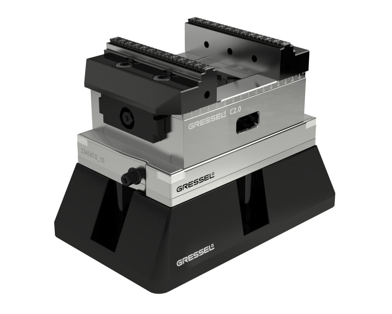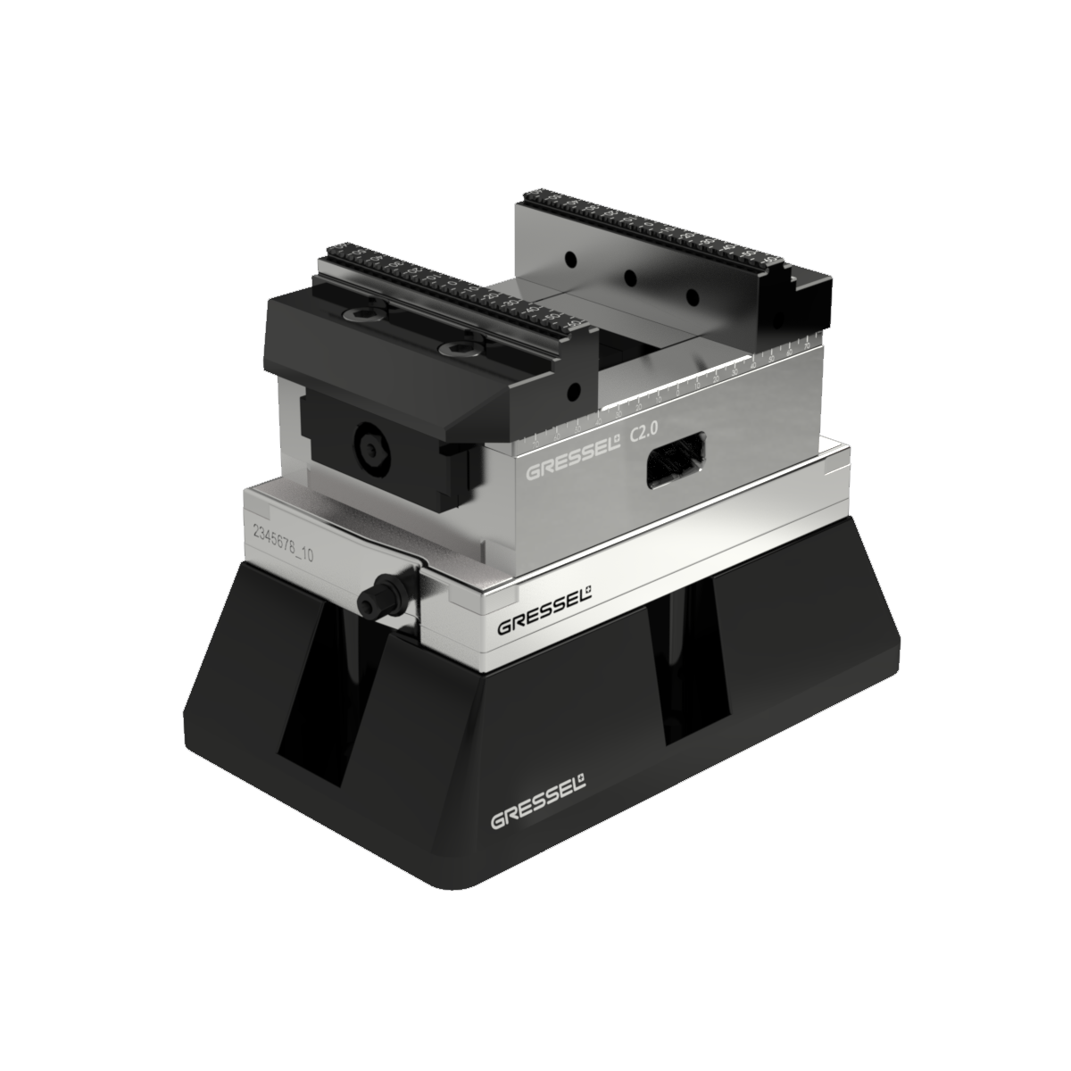 5-axligt centrerande skruvstycke C2.0 125 L-160 på gredoc-konsol. Inkl. vändbara gripbackar grepp 3 mm