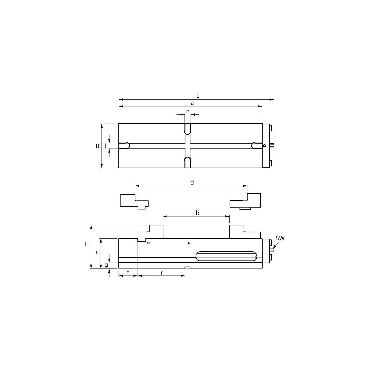 - Gänga på båda sidor (M8), för fastsättning av ett arbetsstyckstopp.