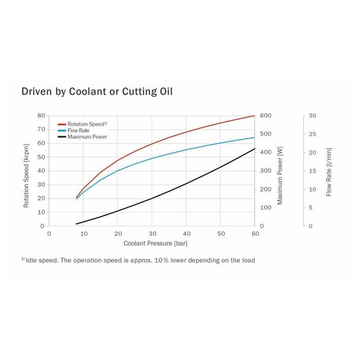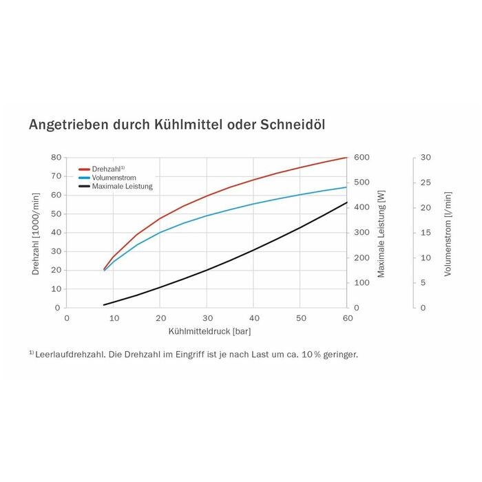Snabbroterande spindel driven med kylmedel (10 – 60 bar), varvtal upp till 75 000 varv/min.