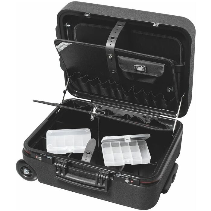 1 indelningsbar bottenlåda inkl. verktygstavla med 18 fack som lock. 2 smådelslådor i bottenlådan (nr 692909 ). 1 verktygstavla med 26 skafthållare, 13 gummiband och 1 ficka för smådelar på fram- och baksidan. 2 dokumentfack fast monterade i locket.