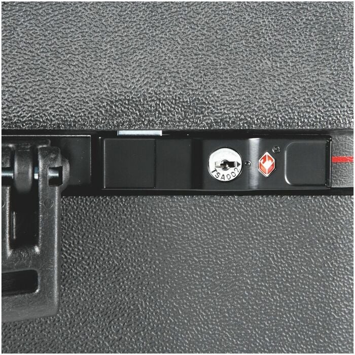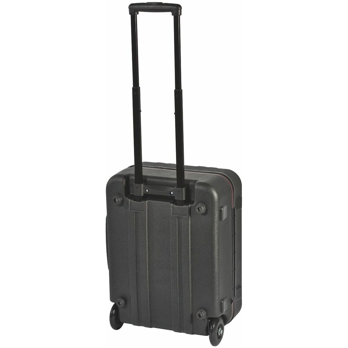 Inbyggda TSA-lås (nr 692915) samt glidskena, metallgångjärn, bärhandtag och 2 kullagrade hjul (⌀ 100 mm).