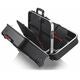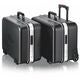 Fristående i alla öppningslägen på grund av ihakande lockhållare med gångjärnsmekanism på båda sidor, vinkel fritt justerbar. Kan öppnas på ena sidan eller båda sidorna. Botten och lock kan öppnas oberoende av varandra och har vardera 2 metallvipplås för fixering. Botten kan säkras ytterligare med 1 tresiffrigt kombinationslås.