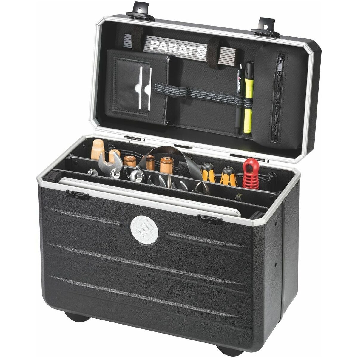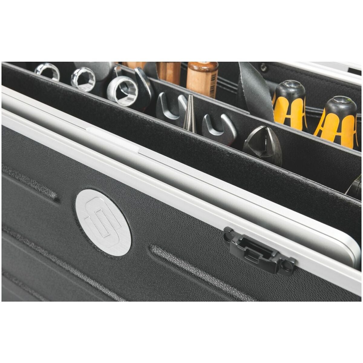 LAPTOOL är verktygslåda och affärsportfölj i ett. Med plats för upp till 39 verktyg och en laptop (upp till 17 tum) i ett separat vadderat fack. Lås och metallgångjärn inbyggda i stommen. Mobil, tack vare vagn och släta hjul.