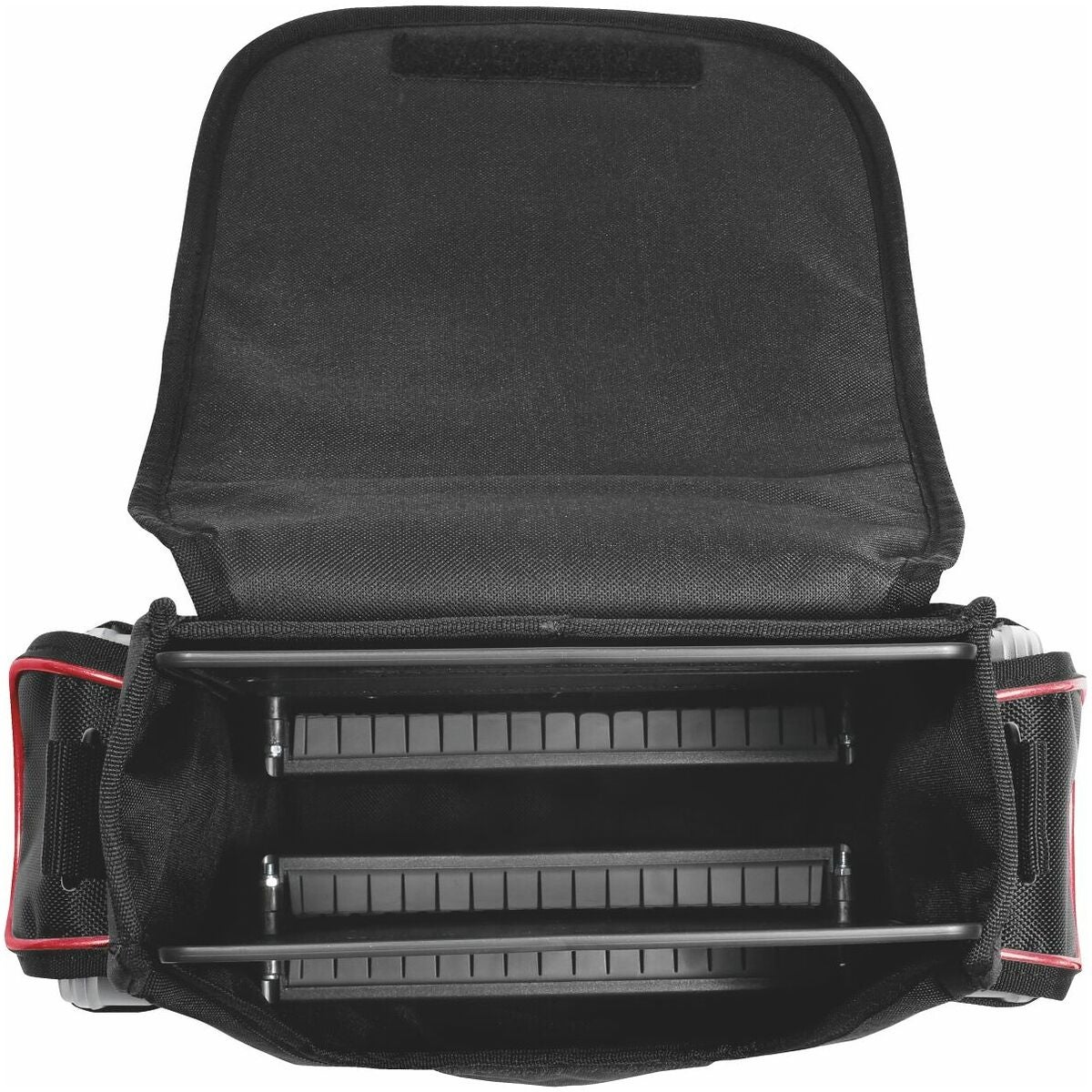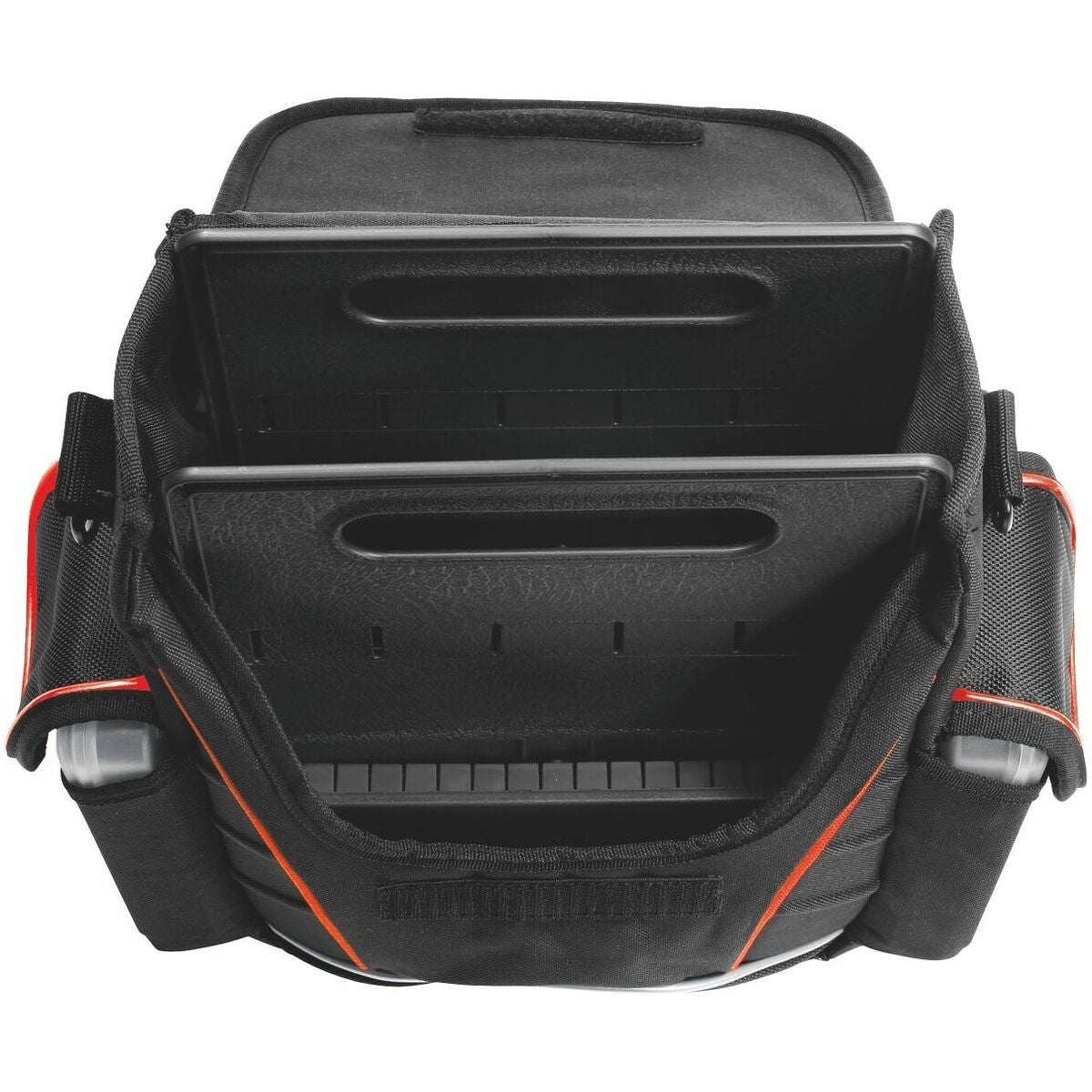 Väska av slitstark, vattenavvisande nylonväv. Patenterat förvaringssystem med 2 löstagbara, slagtåliga verktygstavlor och 2 sortimentlådor för smådelar.
