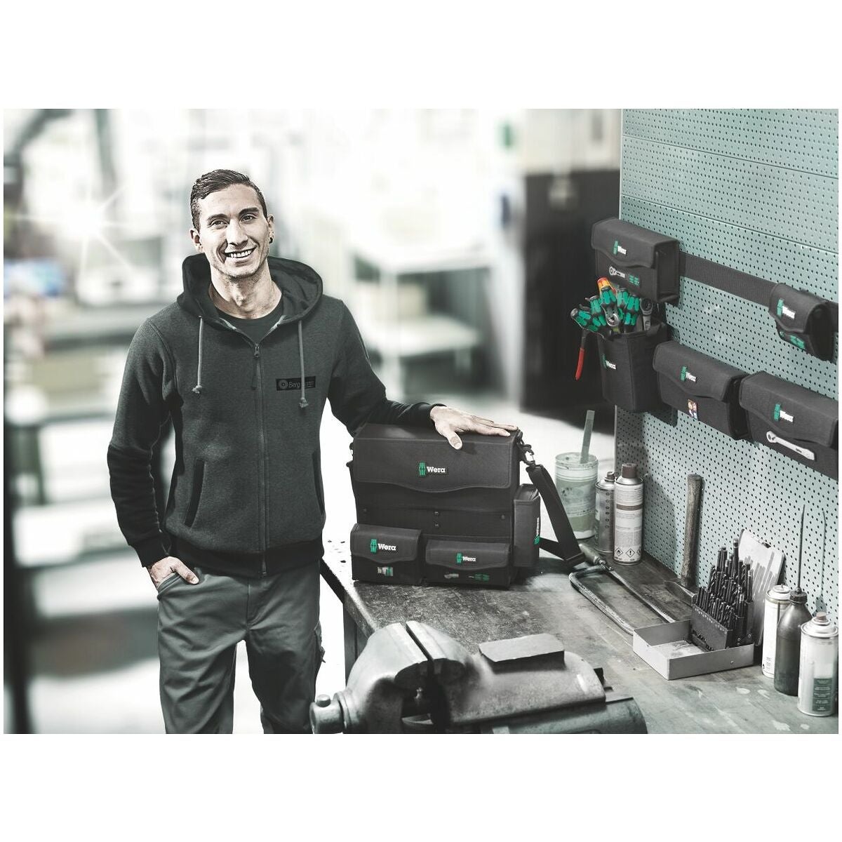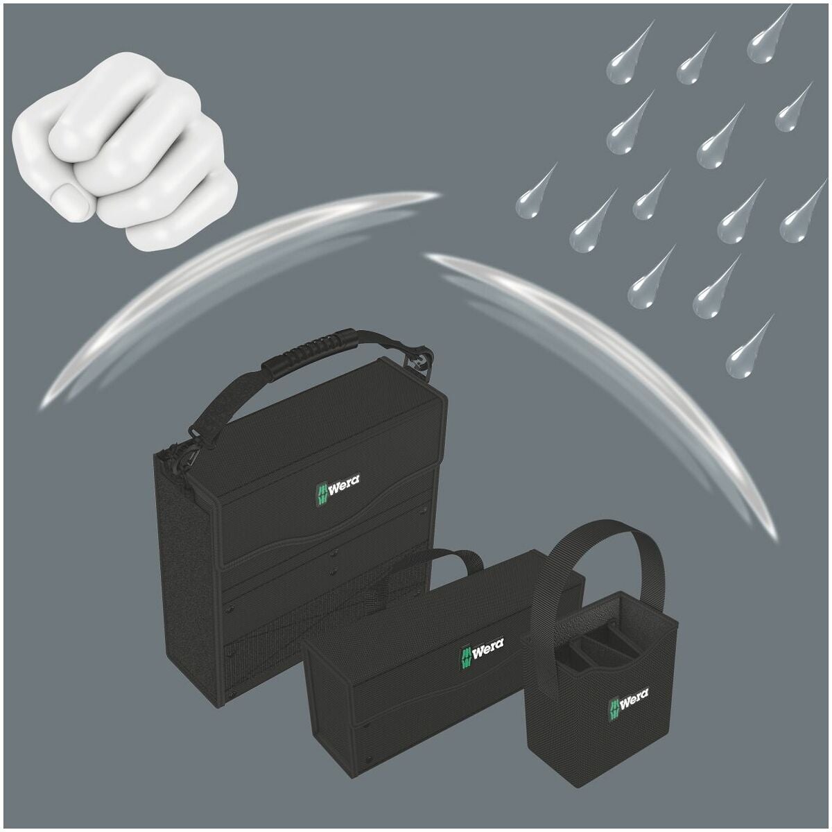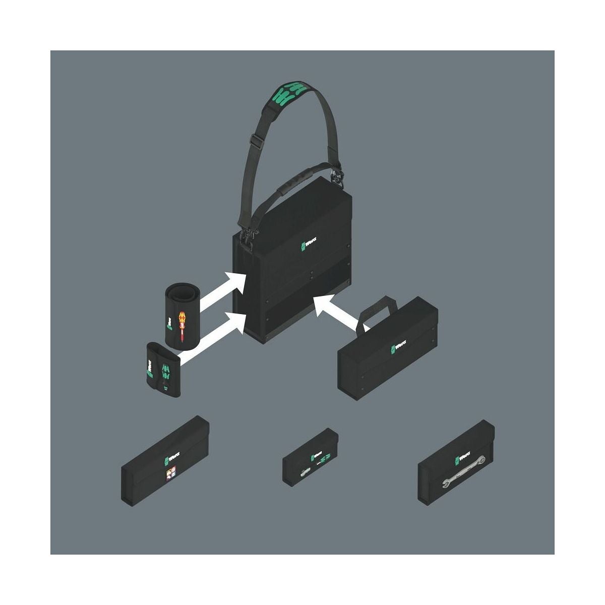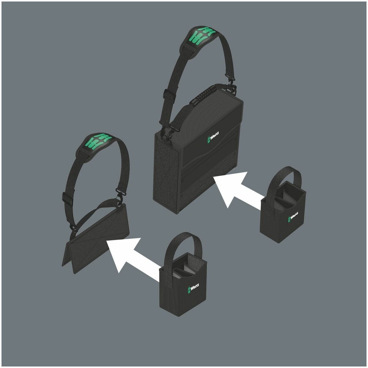 Tack vare kardborrsystemet kan komponenterna i Wera 2go-systemet sättas fast på såväl verktygskassetten Wera 2go 2 som på alla Wera-verktyg i lådor och fickor med kardborrband. Detta möjliggör ett individuellt inriktat arrangemang av verktyg anpassat till respektive arbetskrav.