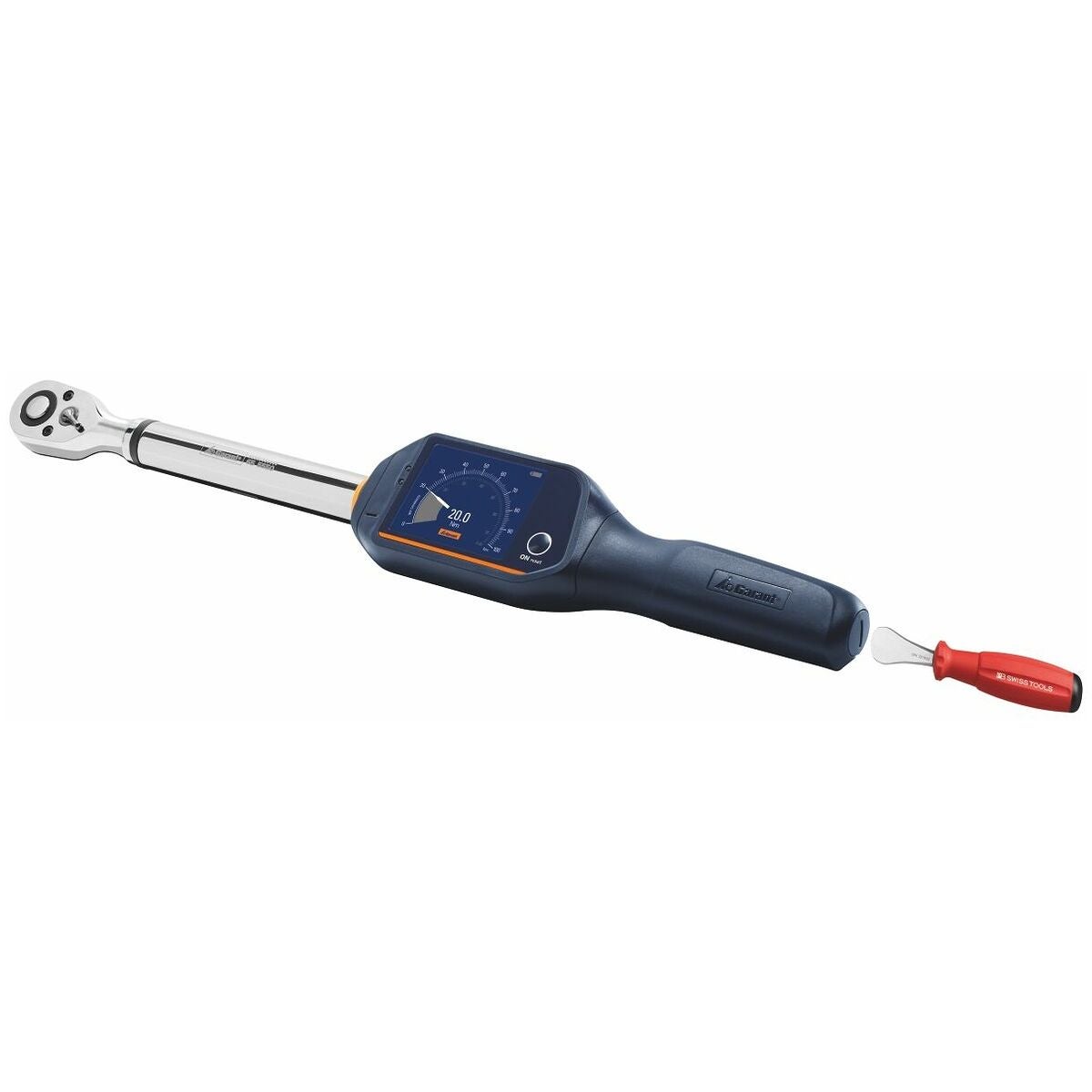 elektronisk högprecisionsmomentnyckel med digitalt mätur Helt i stål, mattförkromat, fast spärrhuvud med utstötare. Digital visning av Nm-värdet och batteriindikering. En knapp för påslagning och nollställning, automatisk avstängning efter 2 minuter.