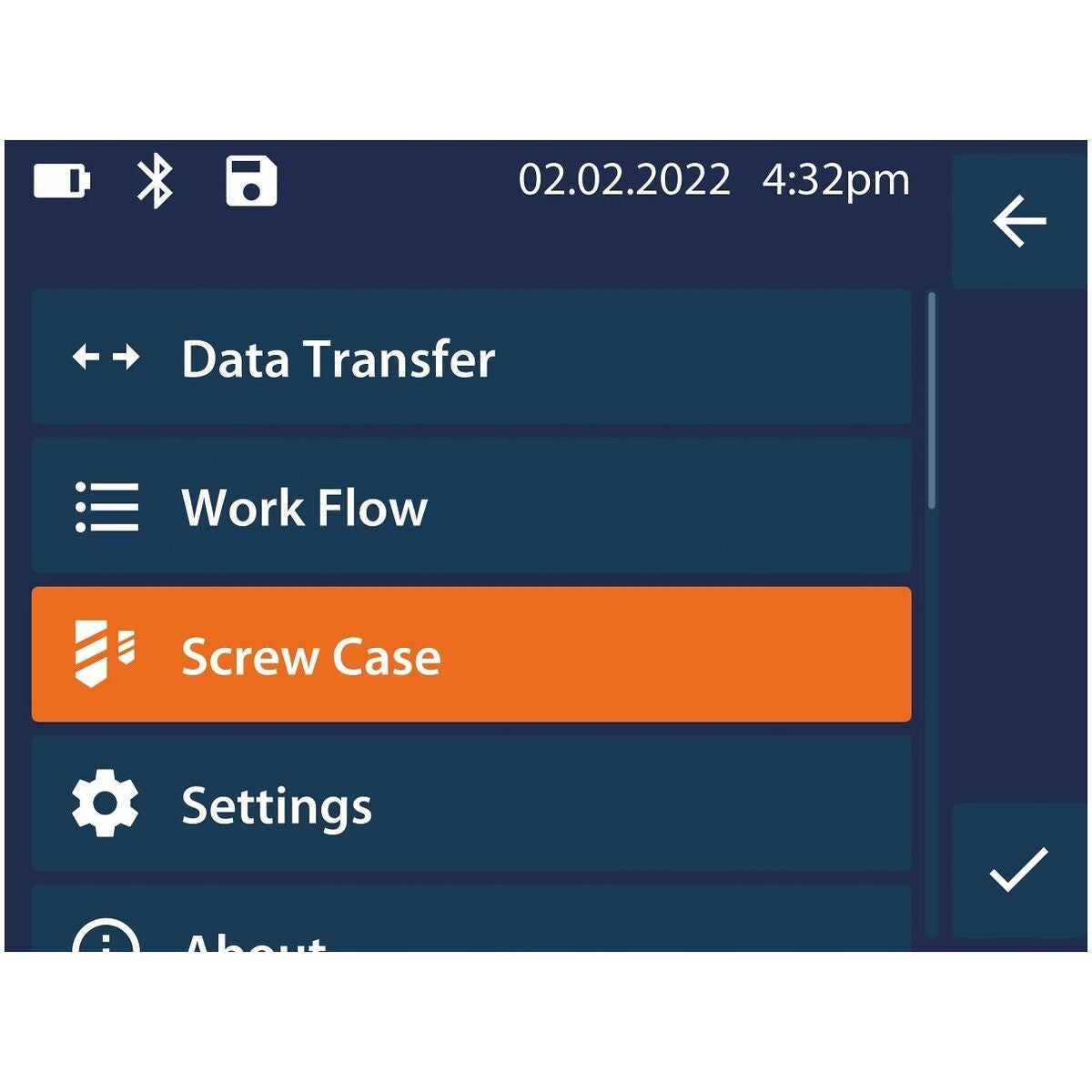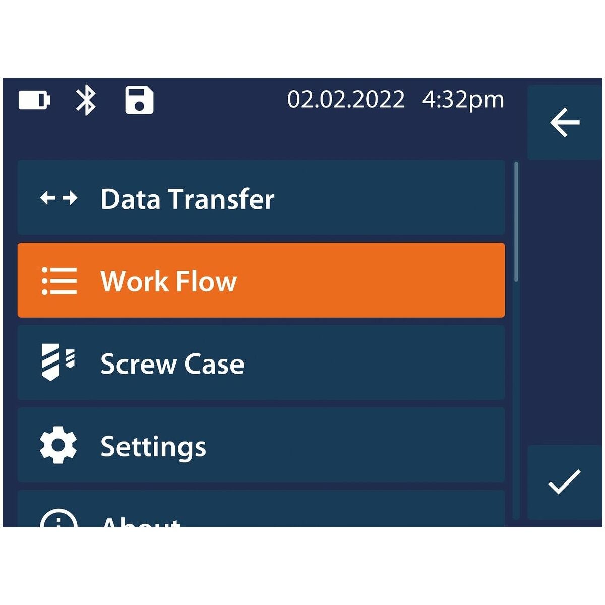 - Lägen: Vridmoment visande; vridmoment utlösande; vridvinkel utlösande; vridmoment utlösande med vridvikelövervakning; vridvinkel utlösande med vridmomentövervakning. Upp till 100 enskilda skruvdragningsfall kan programmeras. Återkommande skruvdragningsfall kan sammanfattas till en förloppsplan (upp till 10 förloppsplaner med vardera upp till 10 skruvdragningsfall). Skruvdragningsfall och förloppsplaner kan programmeras både direkt på nyckeln och bekvämt med hjälp av appen.