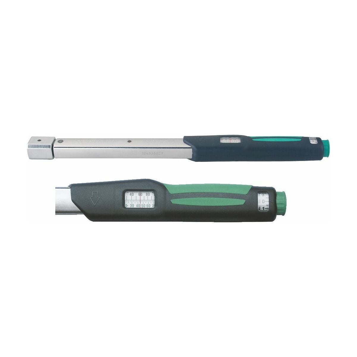 Stabil och kompakt, enarmad momentnyckel med förinställning enligt skala och automatisk utlösning. Den höga noggrannheten förblir oförändrad även efter tusentals åtdragningar, eftersom alla förslitningsdelar tillverkats av förstklassiga material samtidigt som den böjliga stången belastas mycket kortvarigt. Hus och handgrepp av stabilt fyrkantrör. Skalan justerbar i efterhand.