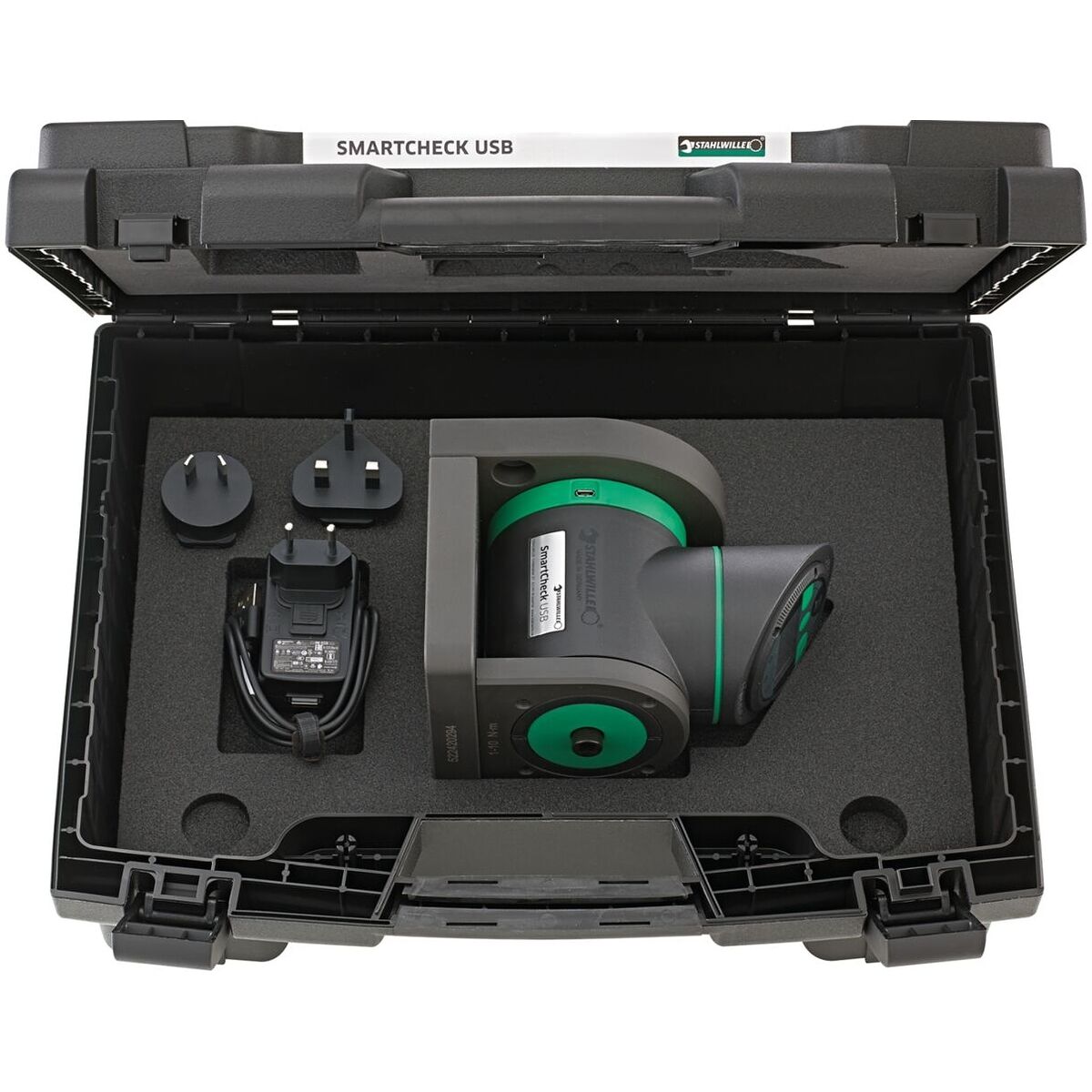 Inklusive nätdel och programvara SmartCheck USB för överföring av värden och upprättande av provningsintyg. I stabil plastväska.