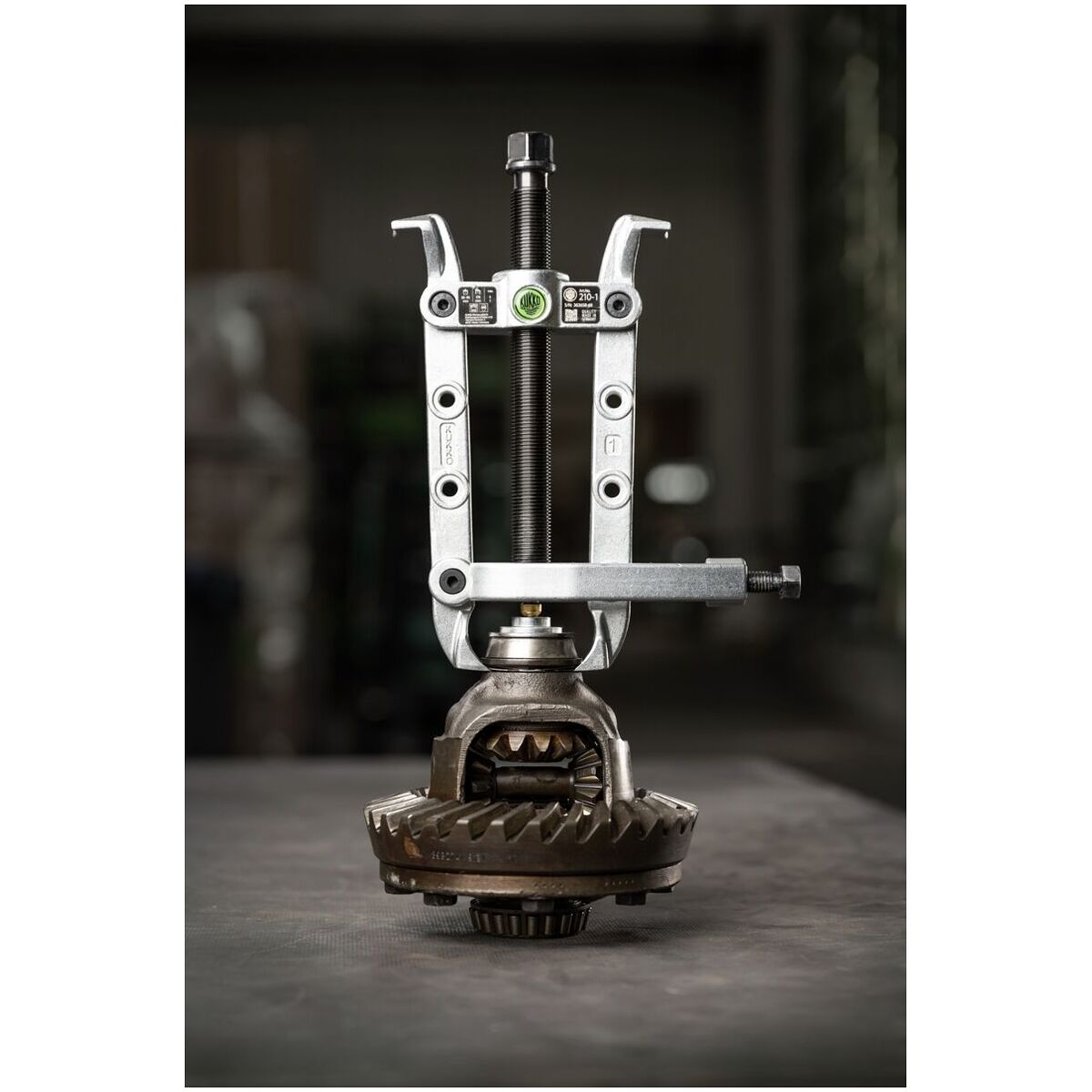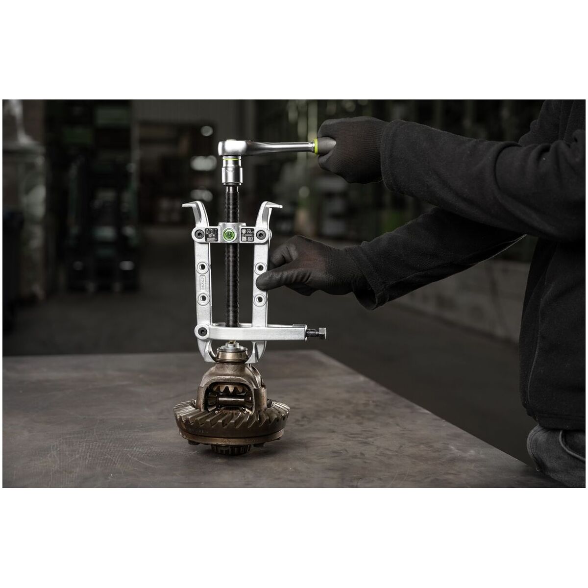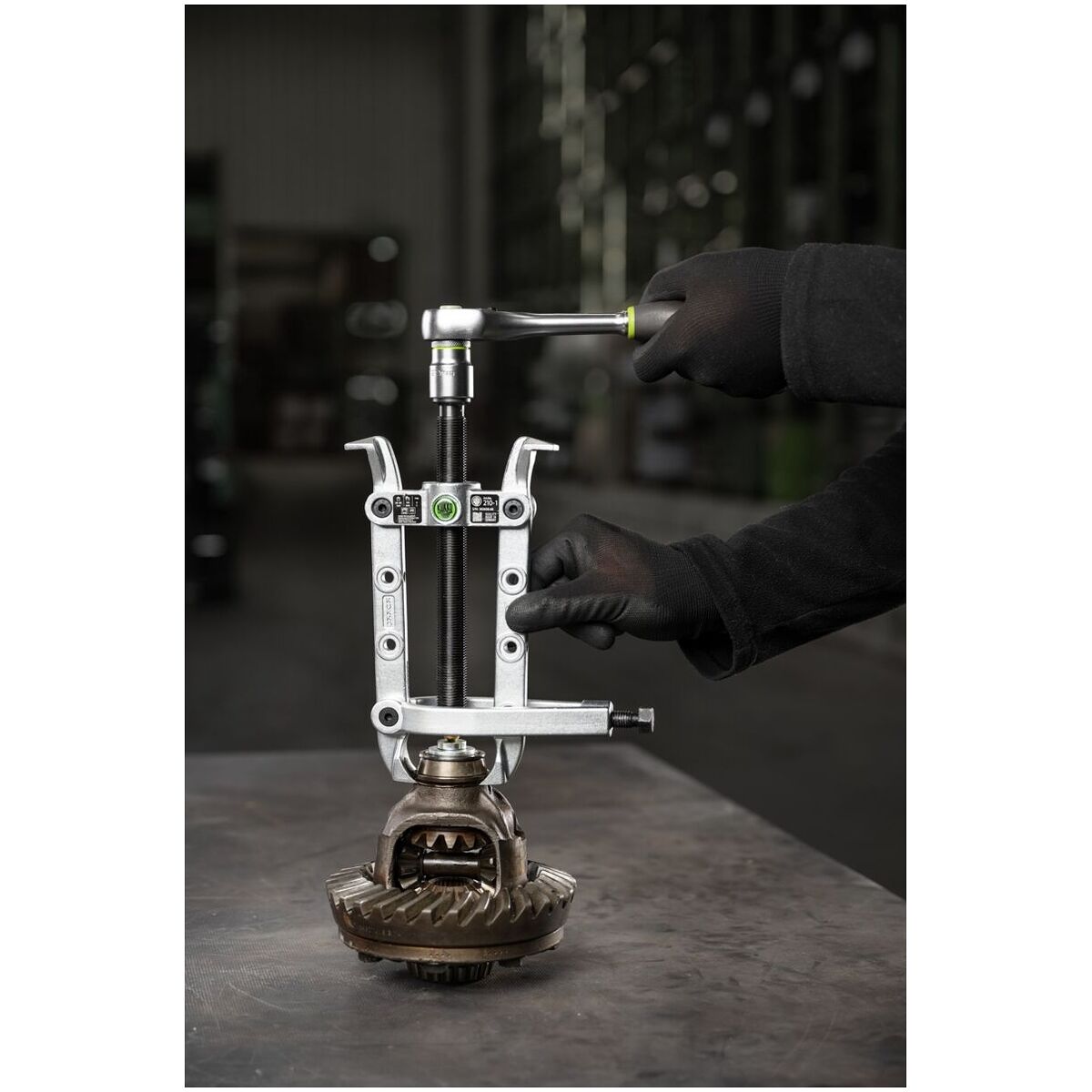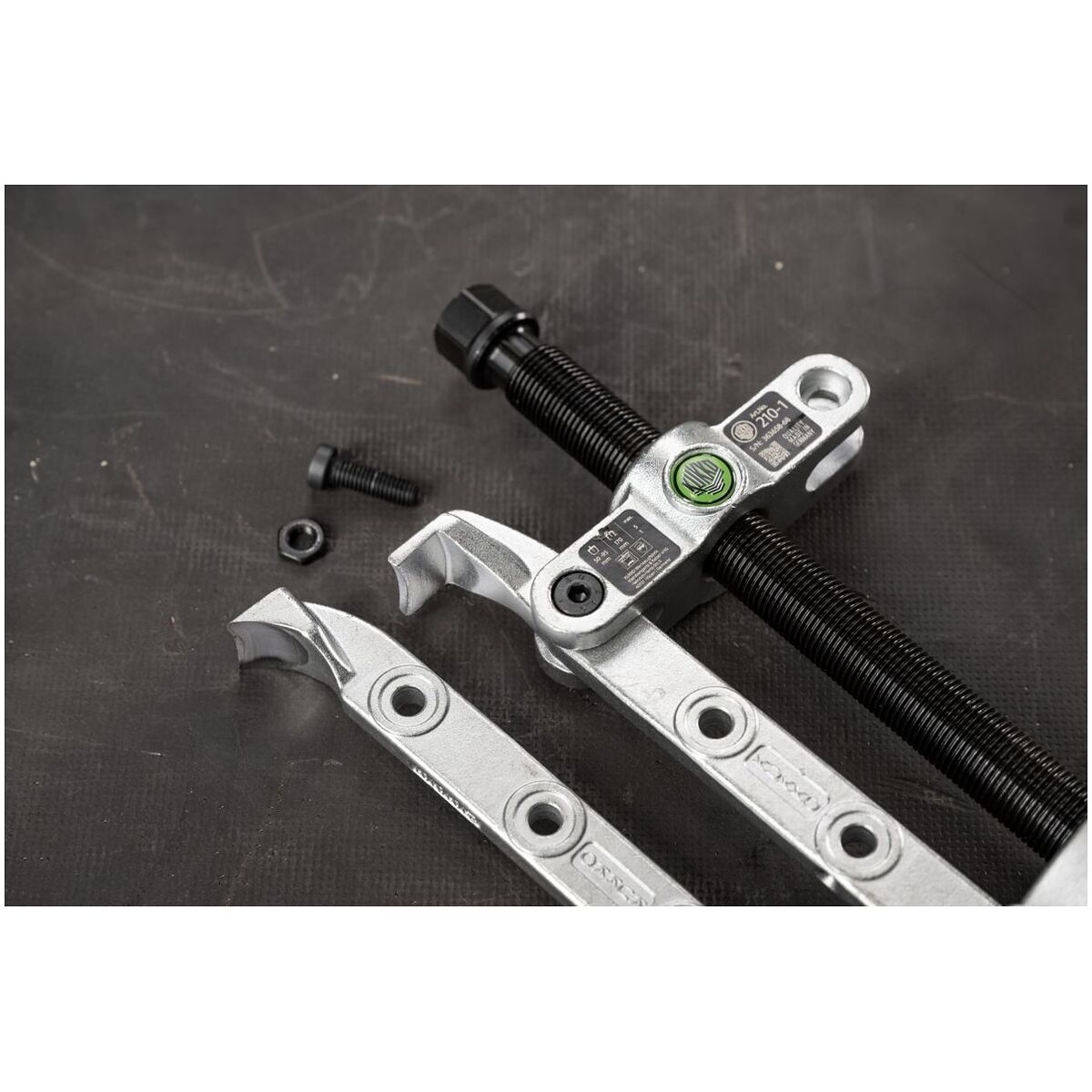 Ena sidan med demonteringsklor för lossning av infällt monterade detaljer, andra sidan med normala avdragningshakar. Vid demontering pressas demonteringsklorna in mellan lager och lagersäte genom att tvingen dras åt. Därefter dras lagret bort med hjälp av spindeln.