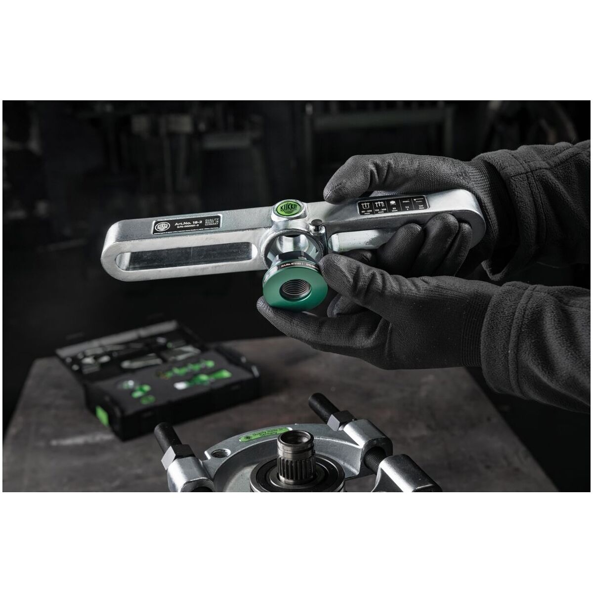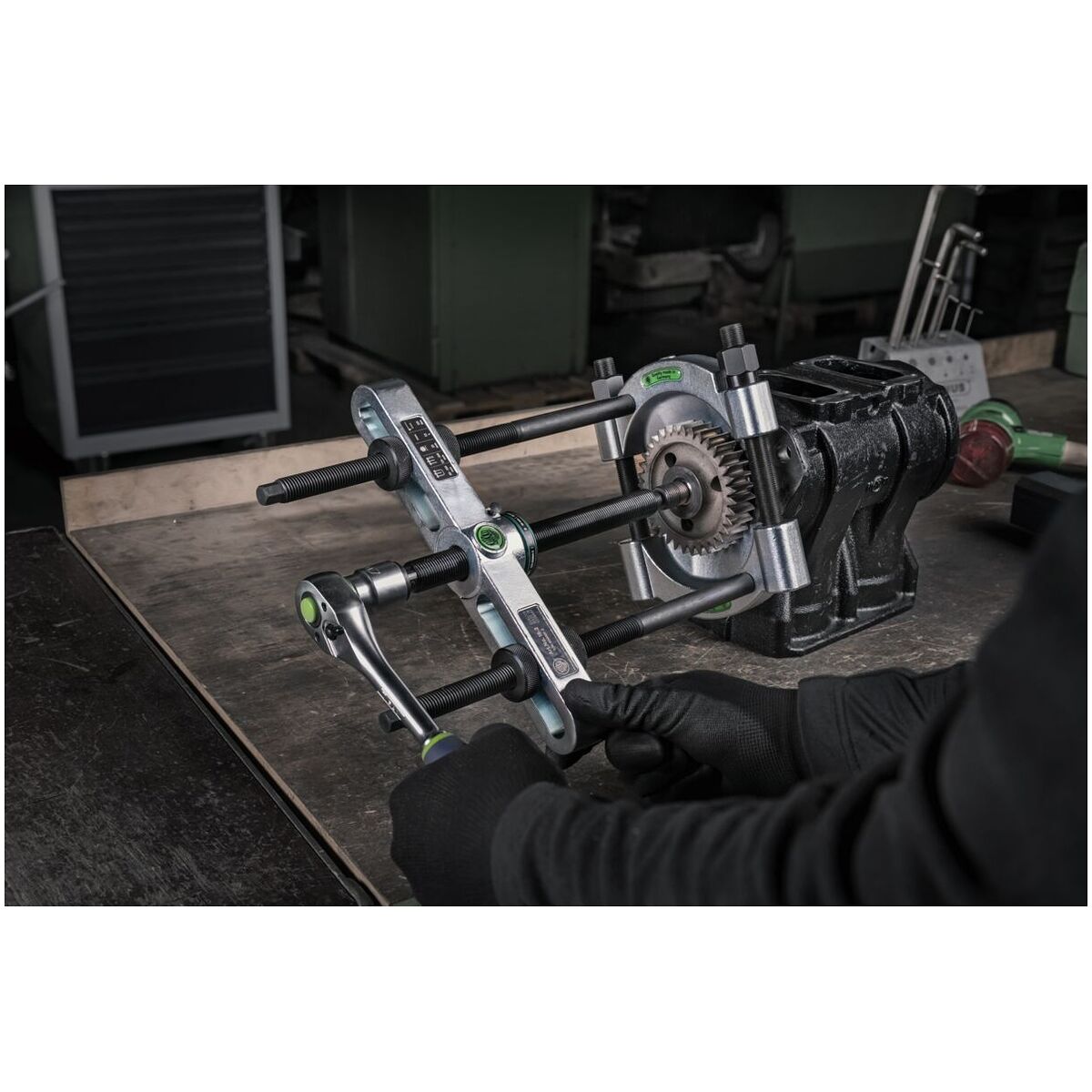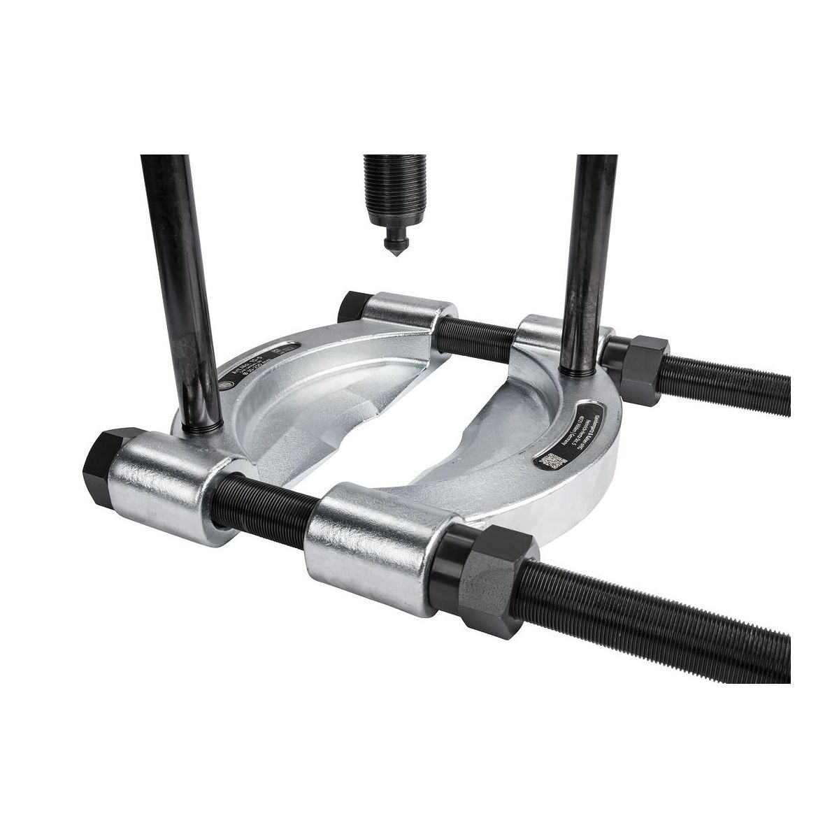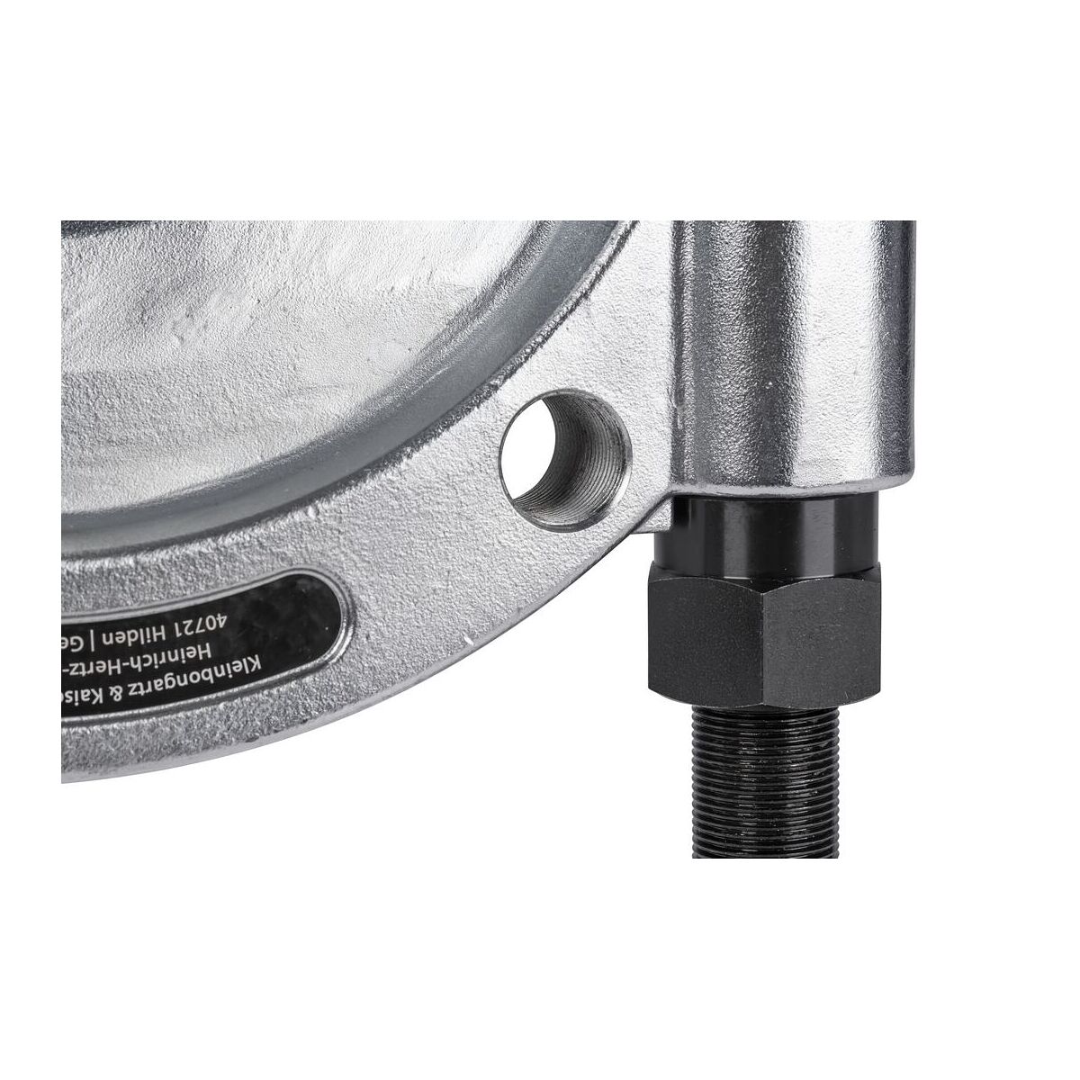 Avdragsanordning: I kombination med demonteringsanordningen för avdragning av det lossade lagret från sätet (dragbultarna skruvas in i de gängade hålen i demonteringsbackarna).