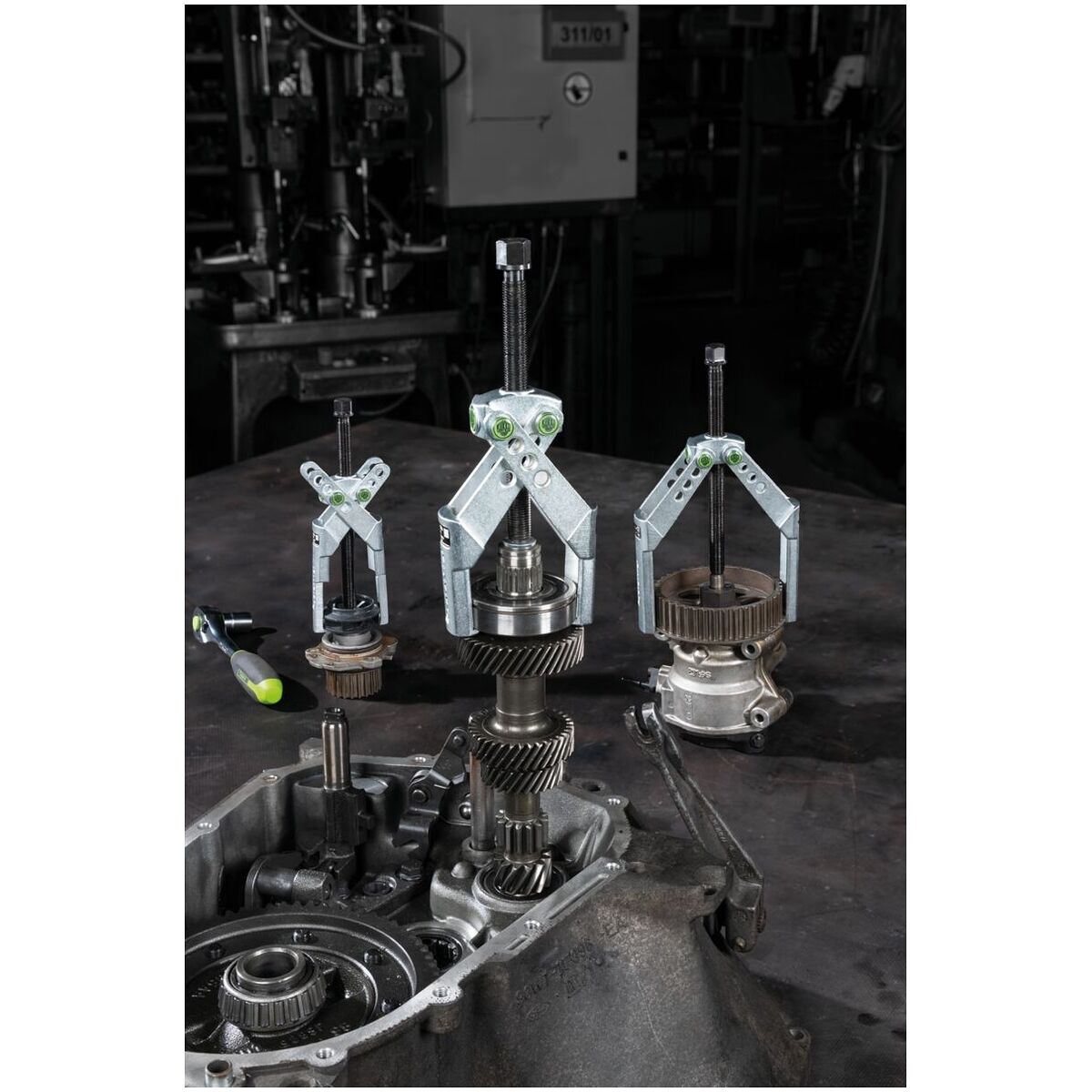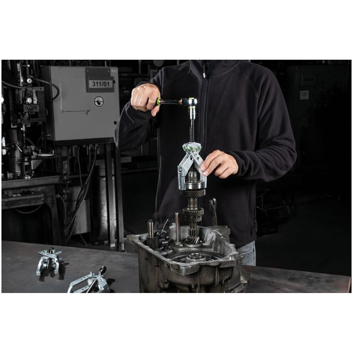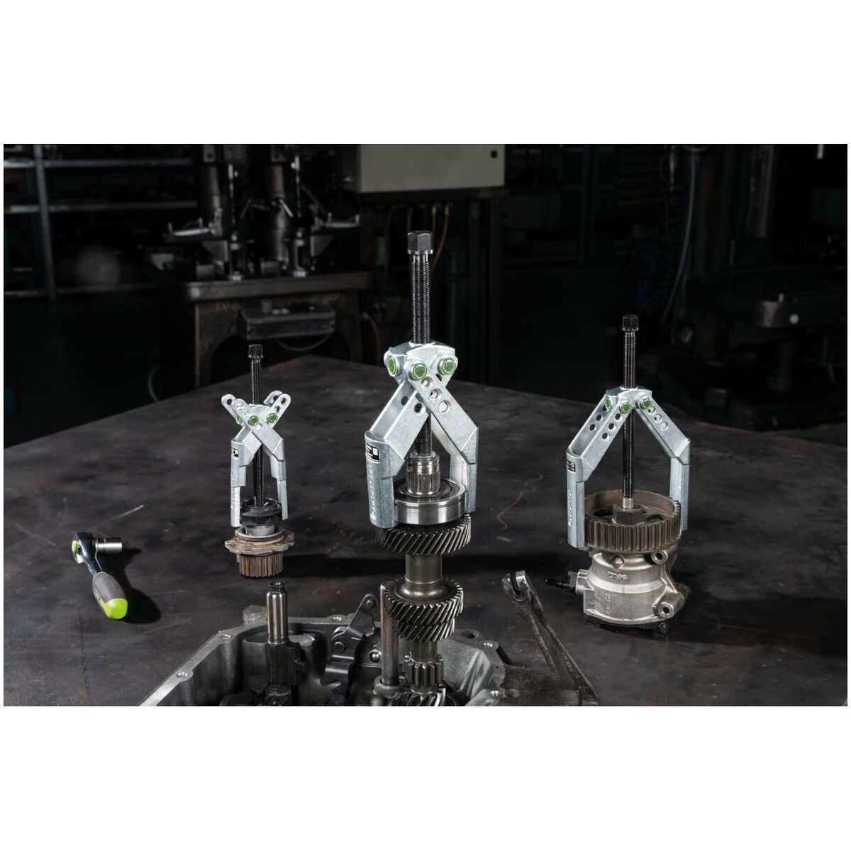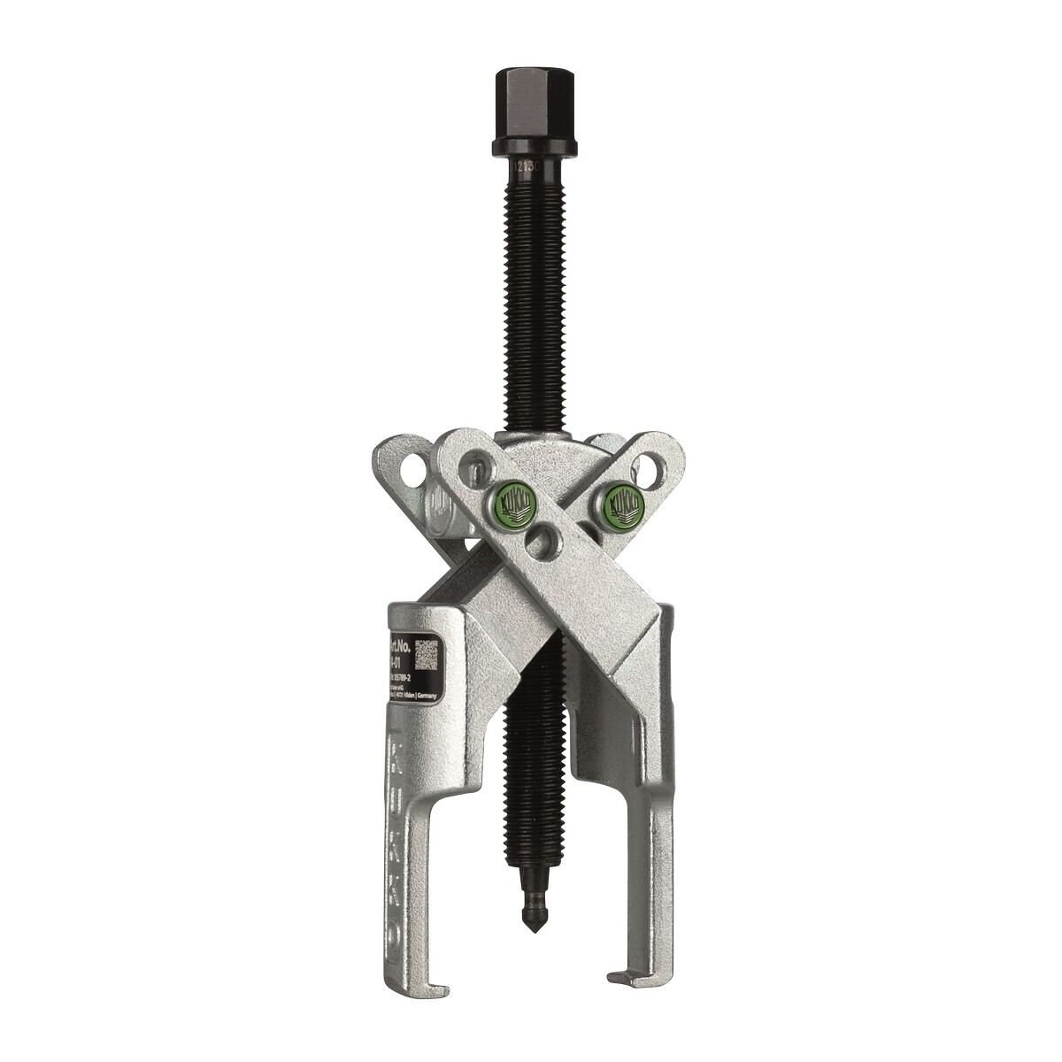 Med självlåsande hållarstift kan spännvidd och spänndjup väljas individuellt. Tack vare en speciell konstruktion är avdragaren självspännande och mycket enkel att hantera. Extremt stort spännviddsområde eftersom armarna kan monteras på olika sätt (se bilderna).