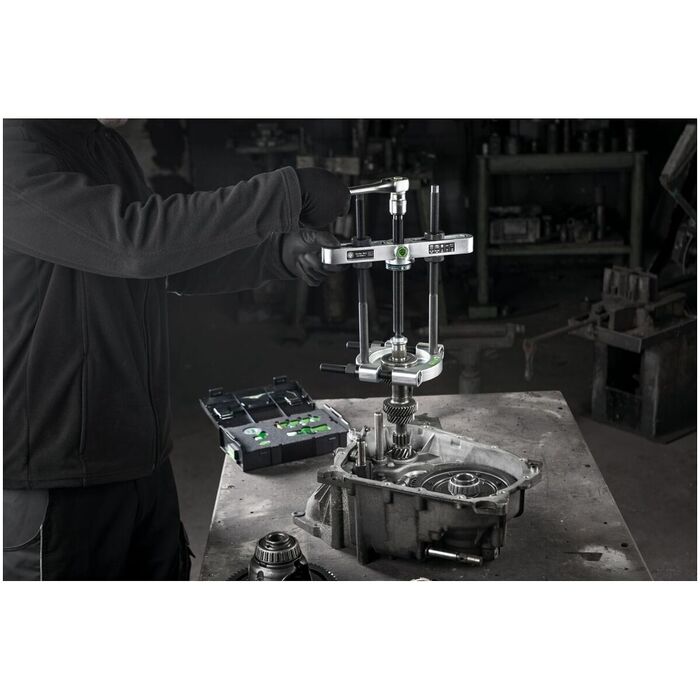 Avdragsanordning: I kombination med demonteringsanordningen för avdragning av det lossade lagret från sätet (dragbultarna skruvas in i de gängade hålen i demonteringsbackarna).