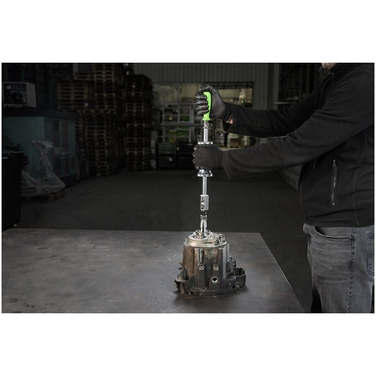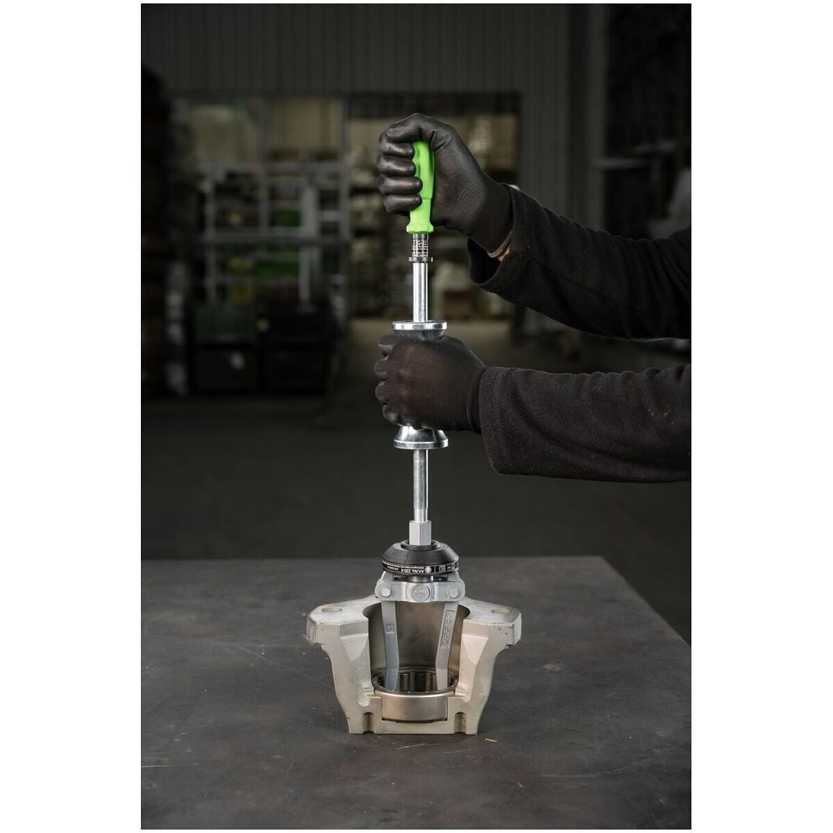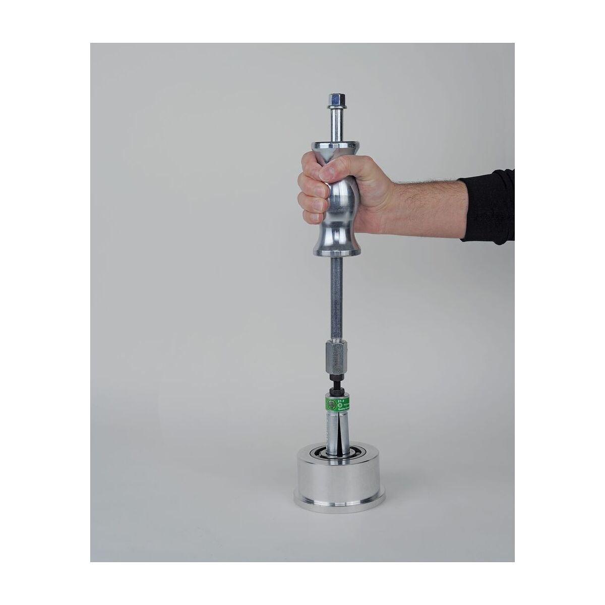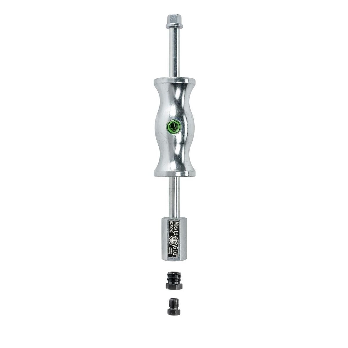 För ur- och avdragning av kullager i kombination med invändig urdragare (nr 882600). Mycket mångsidig användning, även för andra komponenter, tack vare de speciella adaptrarna. Komponenten dras ur med hjälp av kraftiga slag med glidhammaren.