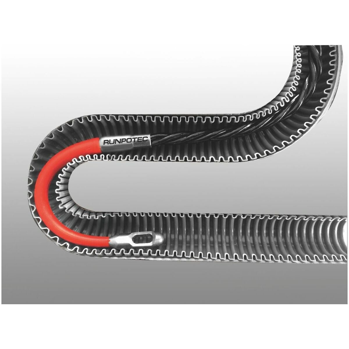 5,3 mm tjock dragfjäder av polyester, 3-dubbel spiral. I båda ändar fastpressad, förstärkt flexibelt styrstift (Runpo-glidelement) med spiralutjämning och dragögla i rostfritt stål. Extremt flexibelt band med en böjradie på endast 20 mm.