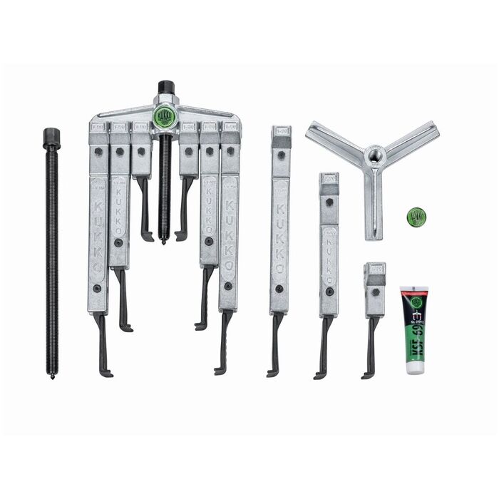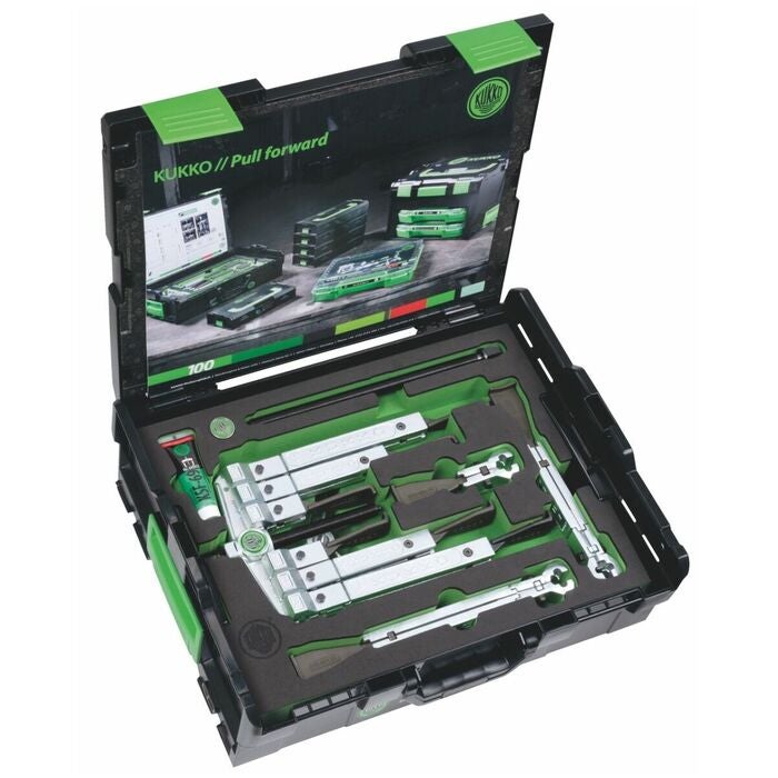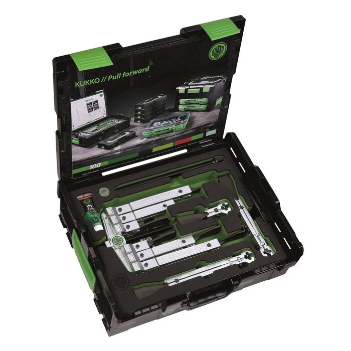 Vardera ett tvåarmat och trearmat ok och vardera tre avdragararmar med olika spänndjup komplett i KUKKO L-BOXX® storlek 136 med skumplastinlägg.