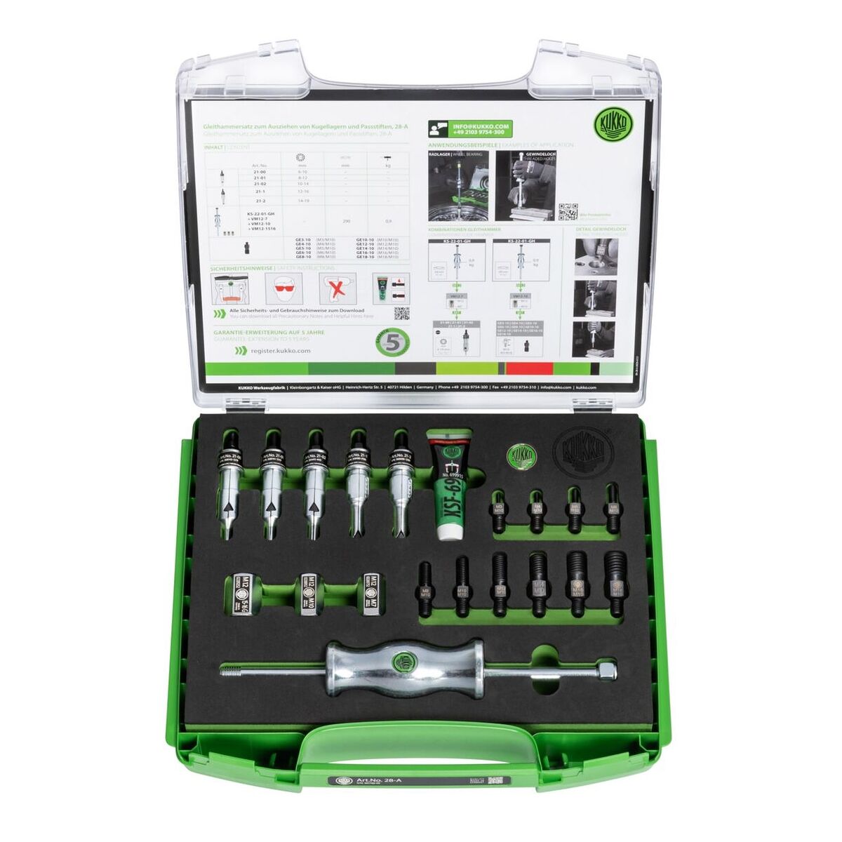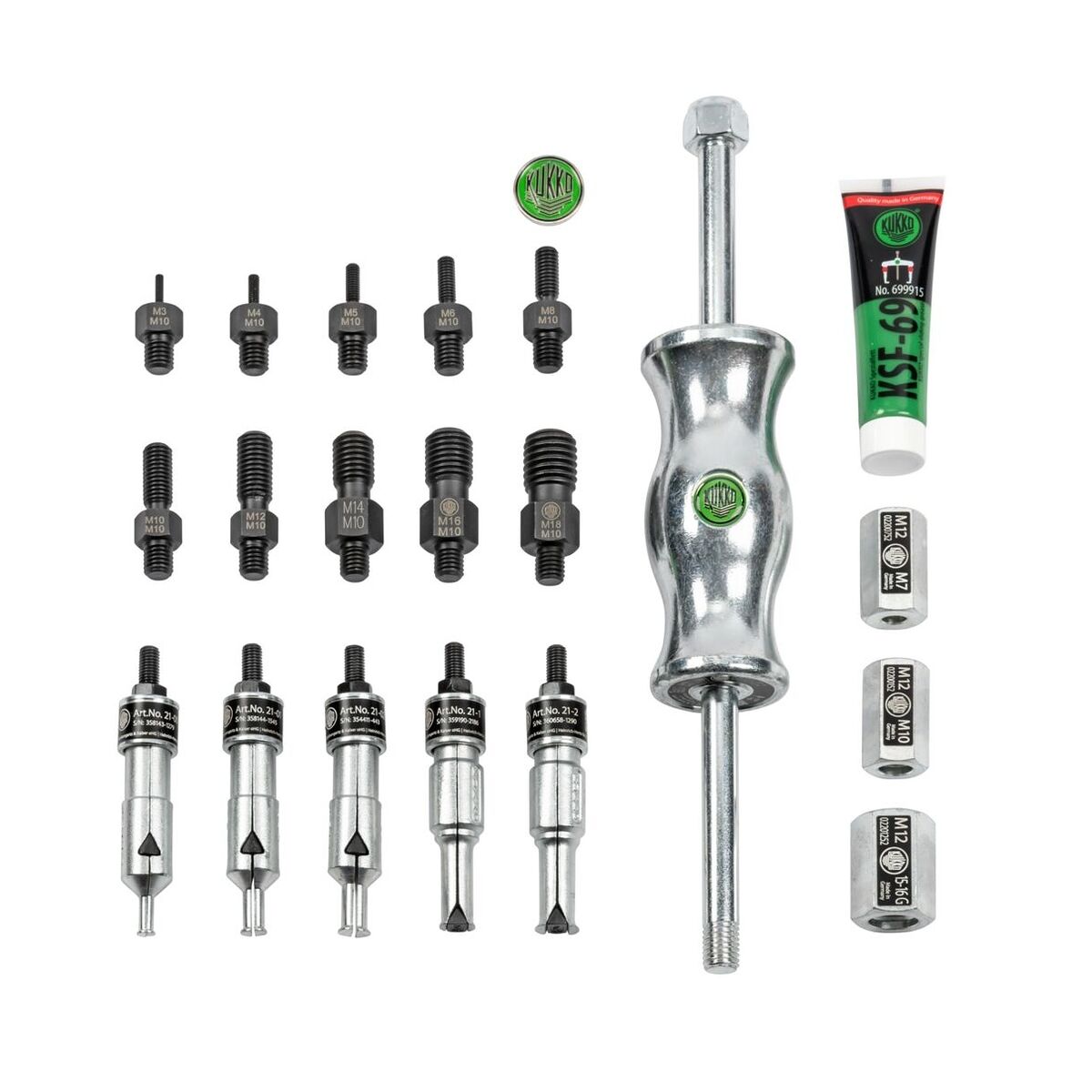Stift- och kullagerutdragare i plastväska (370×320×75 mm) med 10 gänginsatser(M3 − M18), 2 kopplingsadaptrar för invändiga utdragare och 5 invändiga utdragare (⌀ 6 − 19 mm).