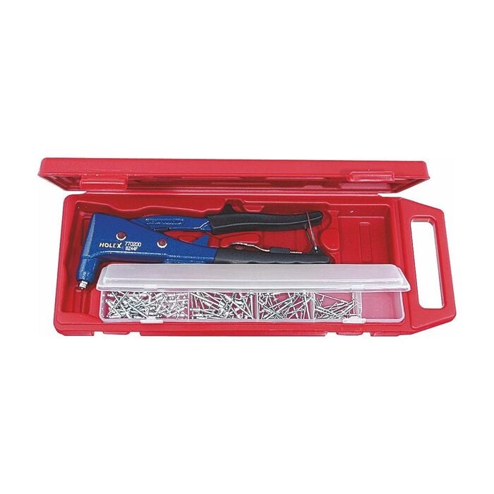 Består av en högvärdig handnittång med hävarmsutväxling och cirka 200 sorterade aluminiumblindnitar, i stabil plastbox.