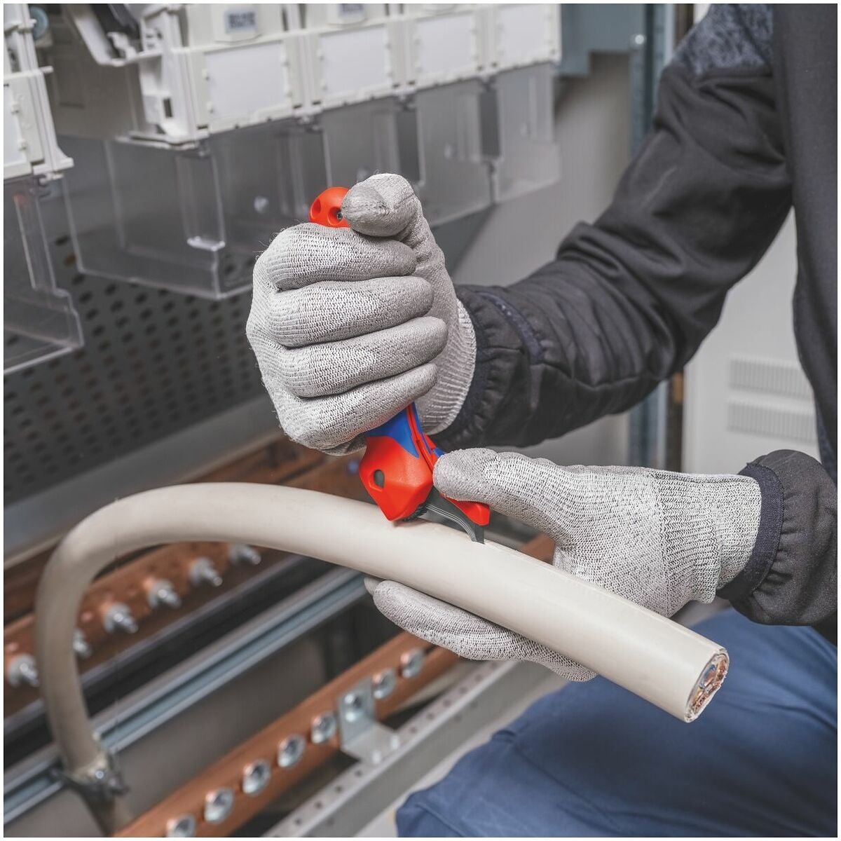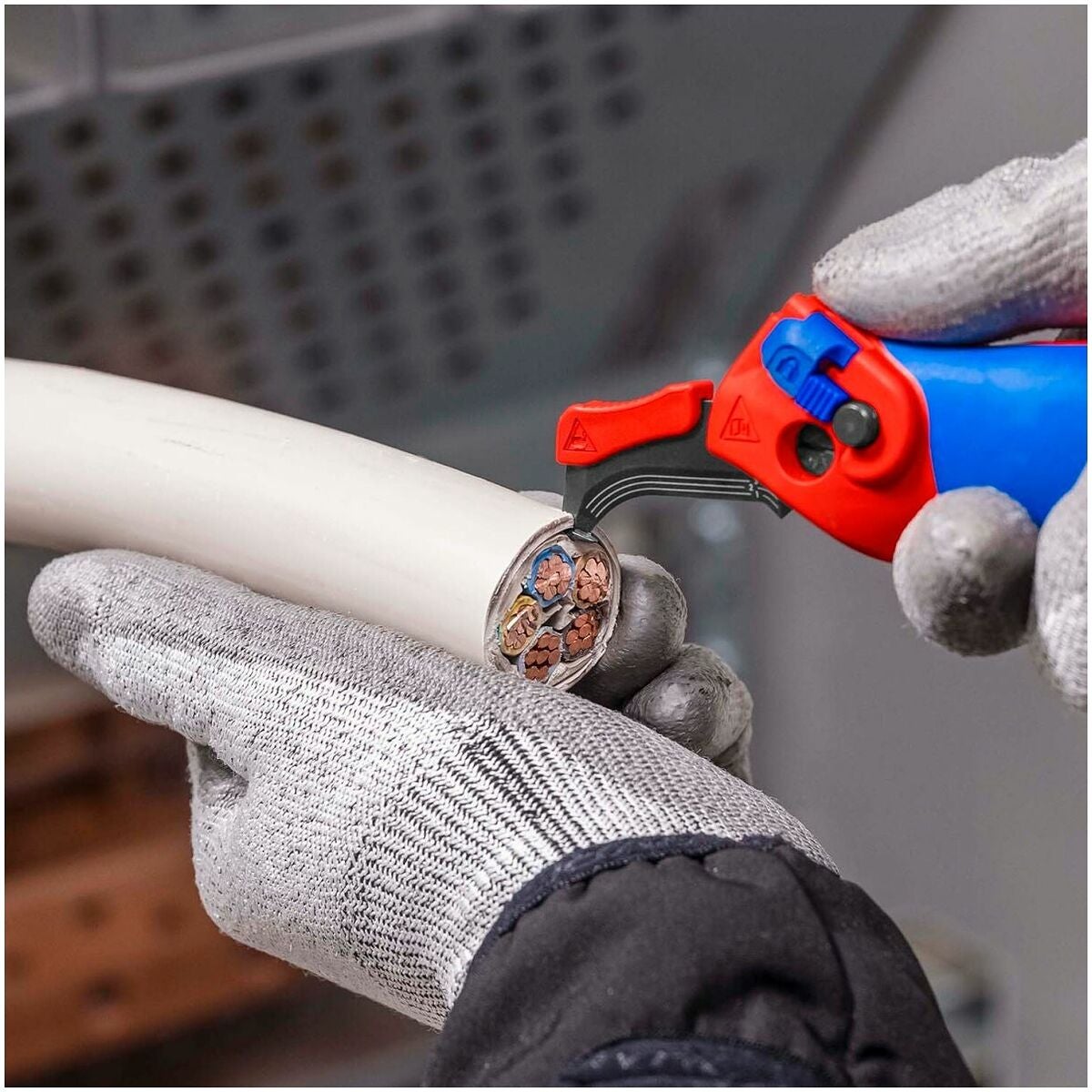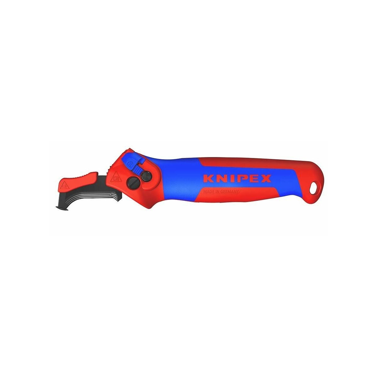 3-stegs säkring av klingan med säkerhetslås, skjutreglage, tryckknapp. Klinga med fyra spärrlägen: Hopfällt, rakt, vinklat och rörligt. Separerar även mycket hårda eller tuffa plastmantlar upp till 7 mm väggtjocklek. Lämplig för längdgående skärning och rundskärning.