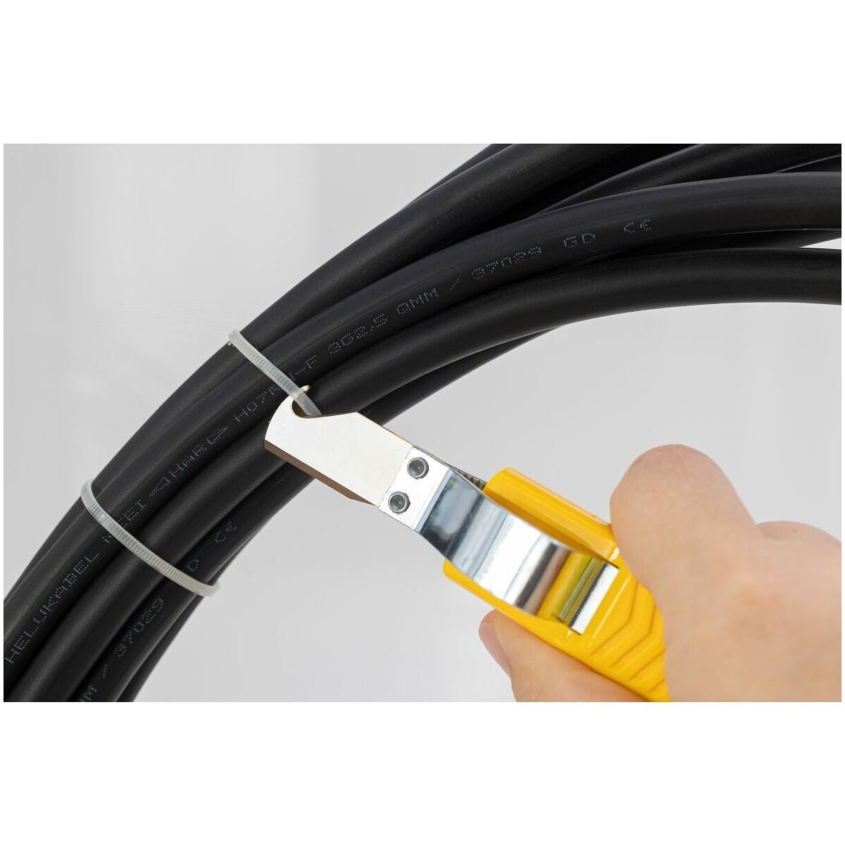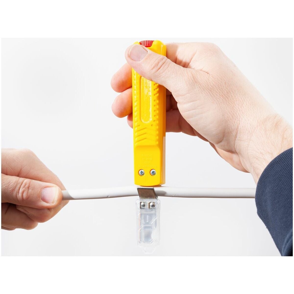 Vridbar kniv för rund- och längssnitt; inställbart skärdjup. Den prismatiska kabelhållaren anpassar sig automatiskt till aktuell kabel-⌀. Kabelmanteln skärs genom att kniven vrids runt och dras i längdled.