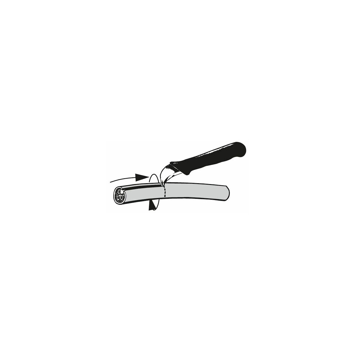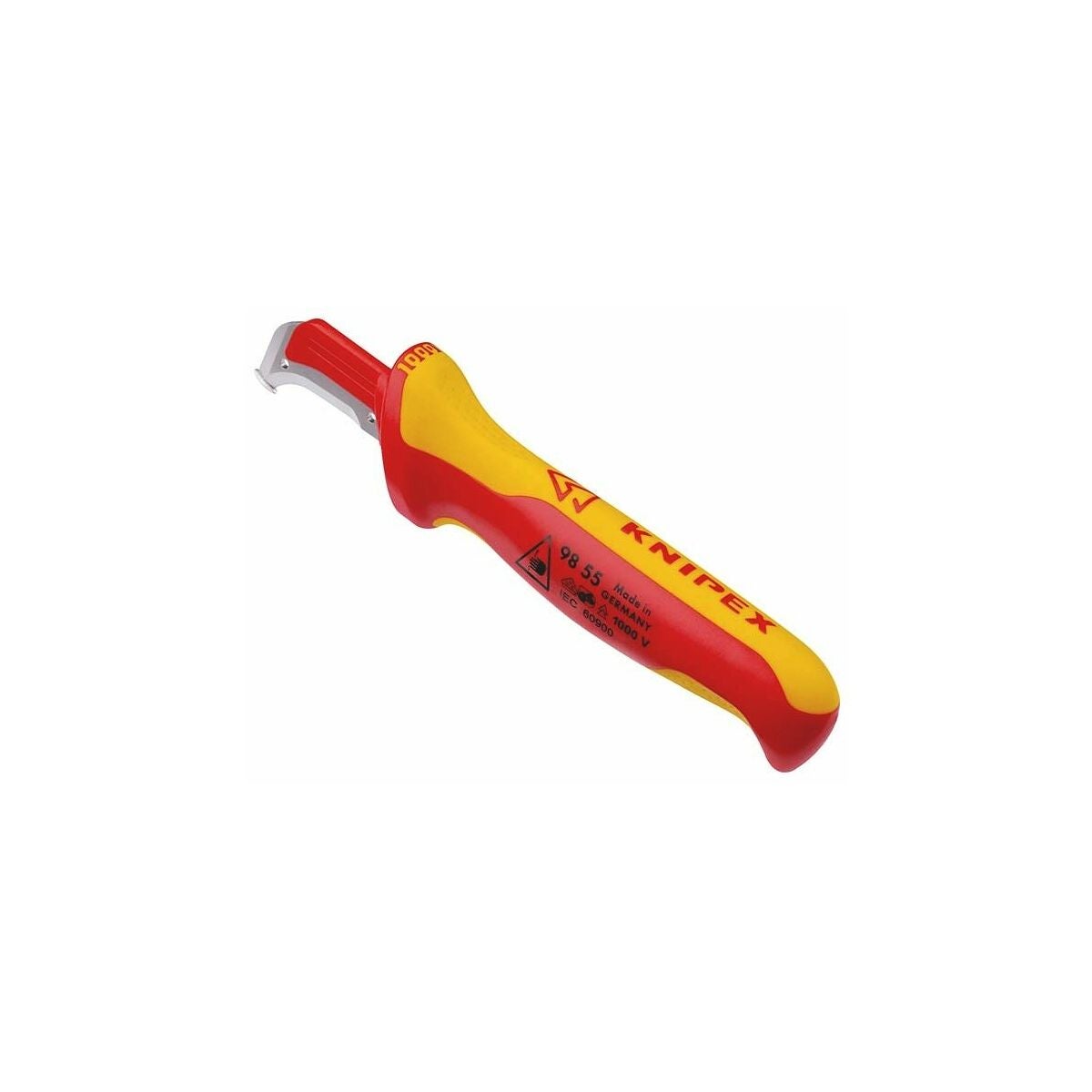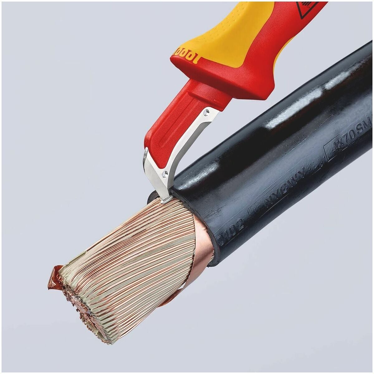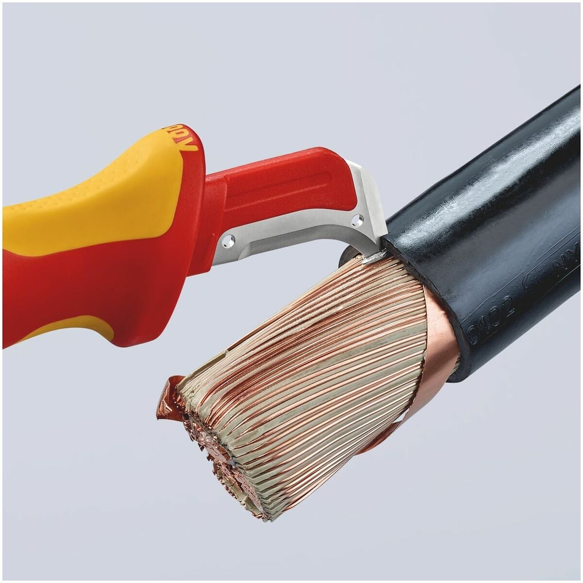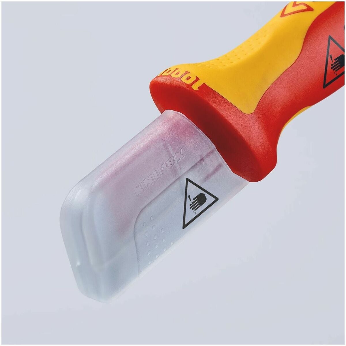 Flerkomponenthandtag med ergonomisk formgivning. Klingan skyddas av transparent skyddshölje. Isolerade upp till 1000 V enligt SS EN IEC 60900 / VDE 0682-201.