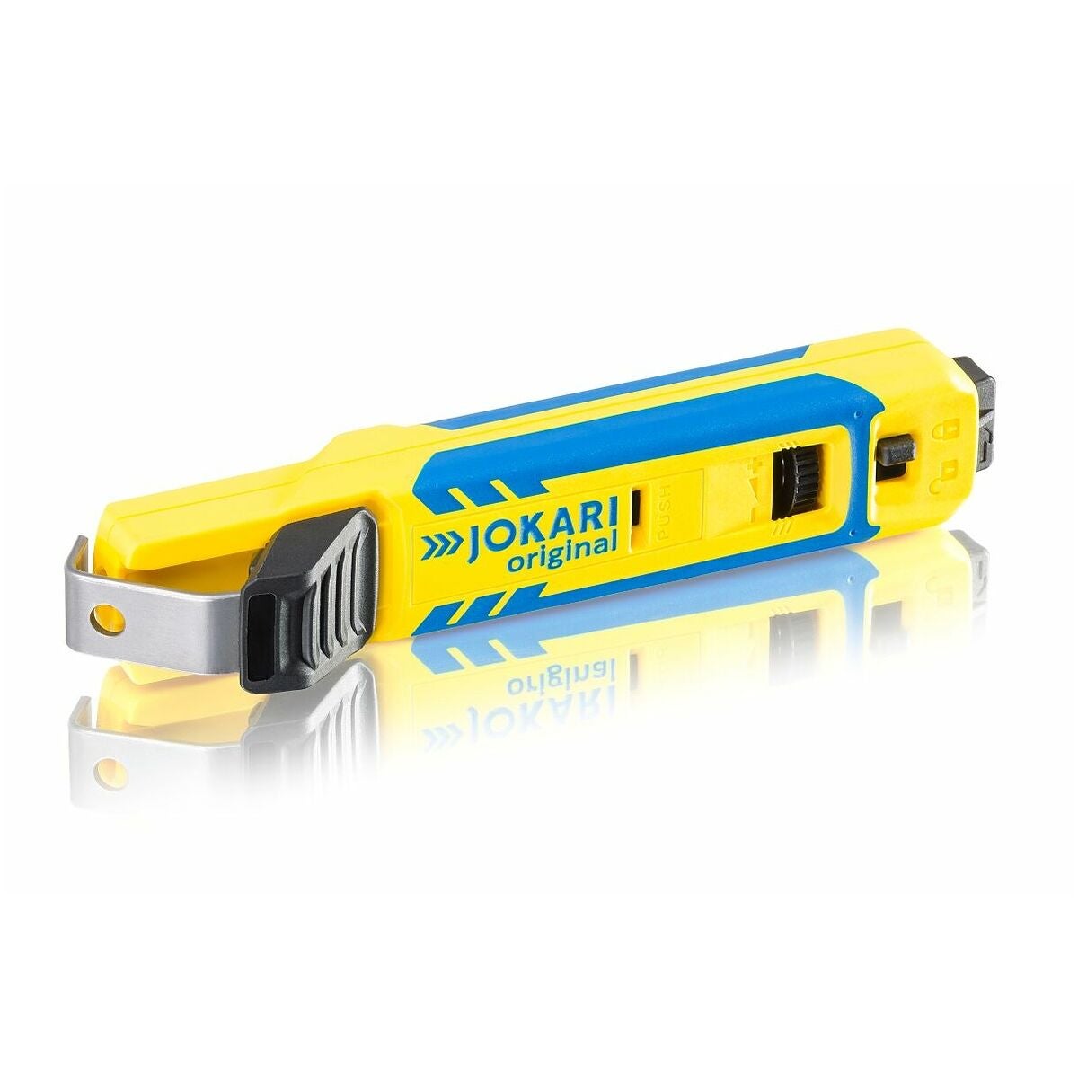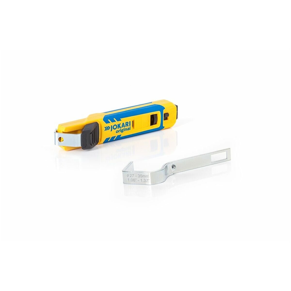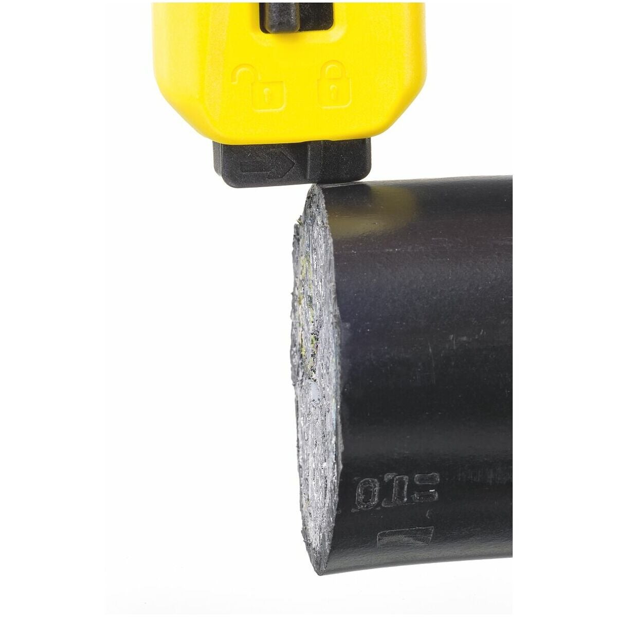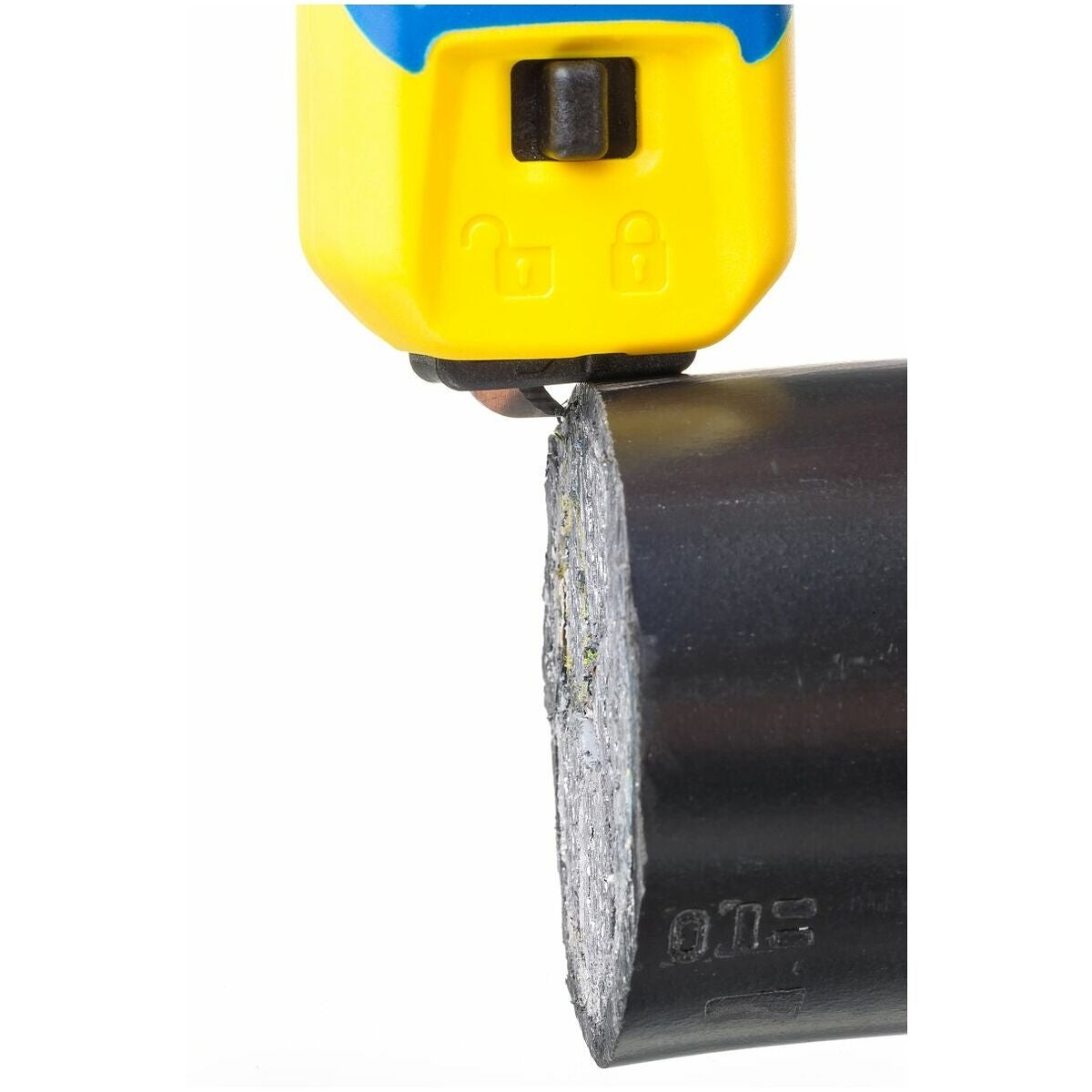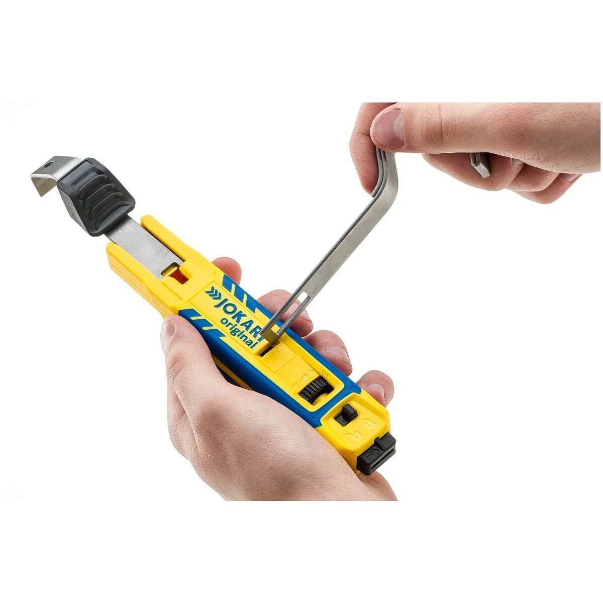 Krokbladets moderna skyddsmekanism i slutet av handtaget garanterar säker hantering och skyddar mot skärskador. Penetrationsdjupet för krokbladet är reglerbart i fyra nivåer. Med 2 utbytbara byglar för kabel-⌀ 8–28 mm och 27–35 mm och extra bygelstorlekar som tillval. Siktfönster på den utbytbara bygeln för optimalt skärförlopp (storlek 8–28 och storlek 4–16).